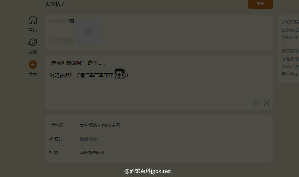 图一“等级机制说明”,这个……说明在哪?(词汇量严重不足)——————————————————图二点击“@馆友”那栏后,页面变黑。没了 评论({{ count }})条 只看作者 {{ form.sort_type == "desc" ? "最新" : "最早" }} 简单说两句... 发表 {{ item.user_detail["nick_name"] }} {{ item.user_detail["title"] }} @{{ at_user.nick_name }} {{ parseTime(item.add_time) }} 来自{{ item.from_region || item.user_detail["city"]||"未知" }} {{ item.user_detail['tail'] || "" }} 回复 {{ item.childs?.length }} {{ item.collect_count }} {{ item.like_count }} {{ comment_child.user_detail["nick_name"] }} @{{ at_user.nick_name }} {{ parseTime(comment_child.add_time) }} 来自{{ comment_child.from_region||comment_child.user_detail['city'] || "未知" }} {{ comment_child.user_detail['tail'] || "" }} 回复 {{ comment_child.like_count }} {{ comment_child.collect_count }} [加载更多] [折叠] 📢 暂无内容 [加载更多] 简单说两句... {{ count }} - - 🤔 ⬆️ ↪️ 回复 ⭐️ 点赞 ❤️ 收藏 ❗️ 举报 ⛔️ 删除 回复 发表 MD内容 图片 视频 表情 @馆友 发表 提到 等 {{ activeAtIds?.length }}人 {{ item.title }} {{ item.nick_name }} 请输入MD格式的内容
