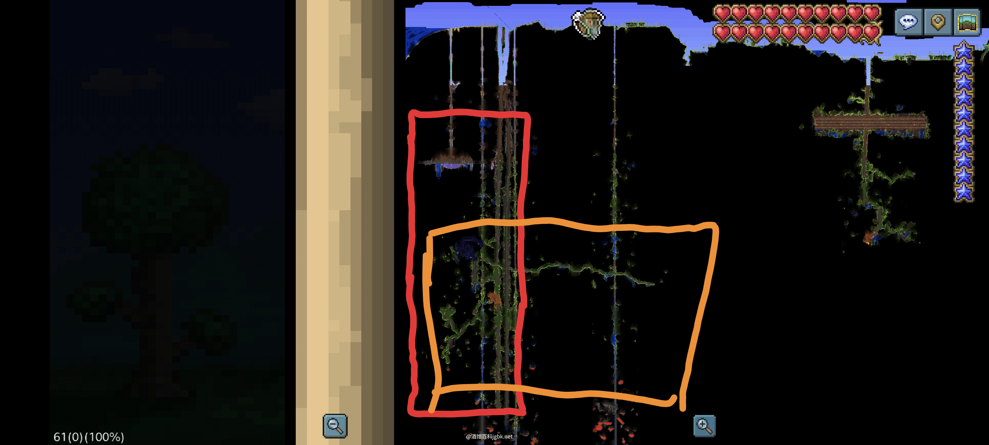 黄色区块是一般的微光生成区,可能会有高度出入,可以看丛林地下庙宇的砖块颜色分辨,这个世界中的丛林地下过大(微光生成看的是丛林地下边缘位置),导致微光位置偏移,于是生成在了备用的红色区块,如果按原本的坐标法是找不到的,需要向靠海方向寻找
