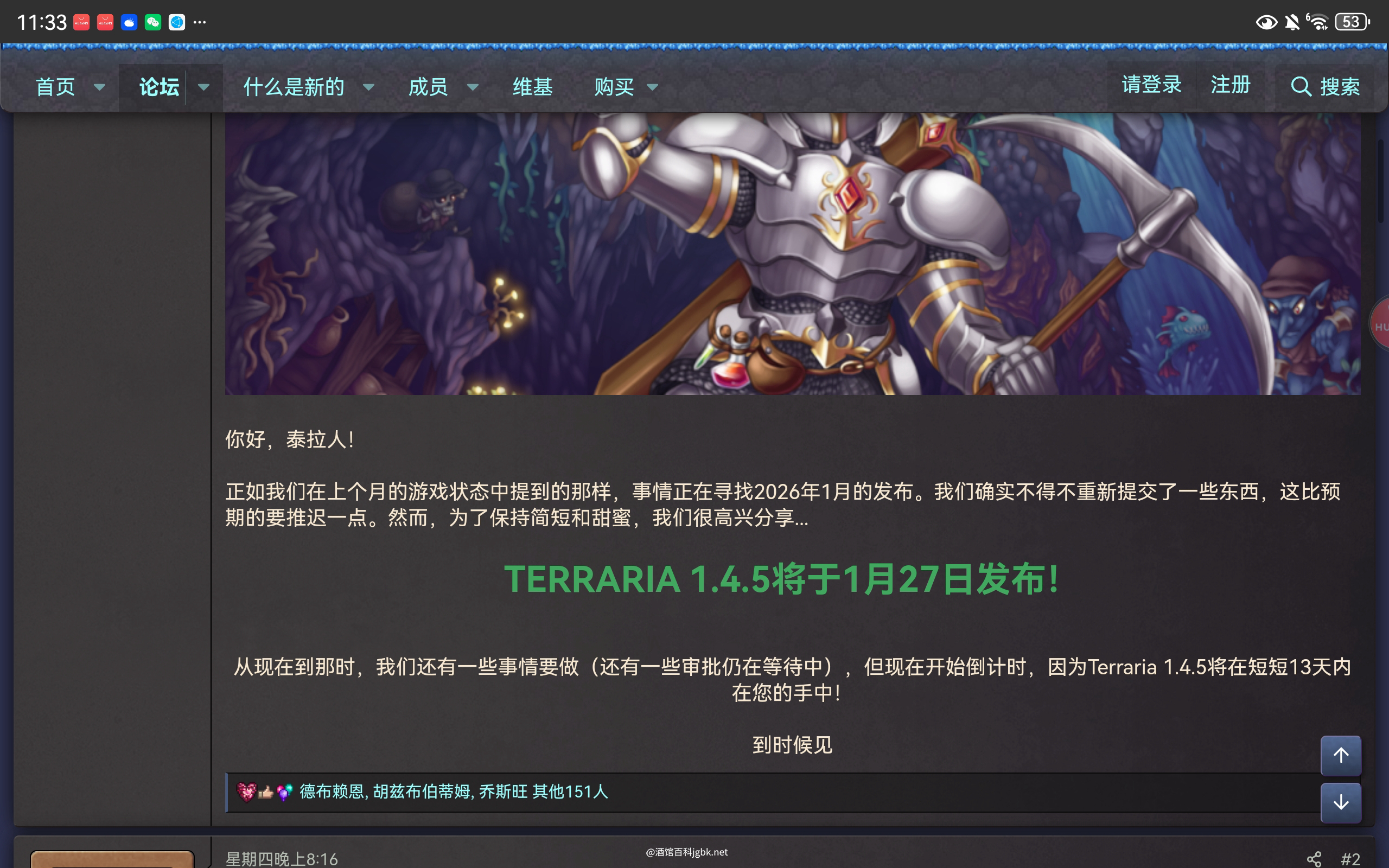 就在1月15日凌晨四点,泰拉瑞亚在官方Wiki上宣布确定1.4.5版本全平台更新日期为1月27日(今年),所有泰P们可以开始提前庆祝了😋😋😋 评论({{ count }})条 只看作者 {{ form.sort_type == "desc" ? "最新" : "最早" }} 简单说两句... 发表 {{ item.user_detail["nick_name"] }} {{ item.user_detail["title"] }} @{{ at_user.nick_name }} {{ parseTime(item.add_time) }} 来自{{ item.from_region || item.user_detail["city"]||"未知" }} {{ item.user_detail['tail'] || "" }} 回复 {{ item.childs?.length }} {{ item.collect_count }} {{ item.like_count }} {{ comment_child.user_detail["nick_name"] }} @{{ at_user.nick_name }} {{ parseTime(comment_child.add_time) }} 来自{{ comment_child.from_region||comment_child.user_detail['city'] || "未知" }} {{ comment_child.user_detail['tail'] || "" }} 回复 {{ comment_child.like_count }} {{ comment_child.collect_count }} [加载更多] [折叠] 📢 暂无内容 [加载更多] 简单说两句... {{ count }} - - 🤔 ⬆️ ↪️ 回复 ⭐️ 点赞 ❤️ 收藏 ❗️ 举报 ⛔️ 删除 发表 提到 等 {{ activeAtIds?.length }}人 {{ item.title }} {{ item.nick_name }} 请输入MD格式的内容