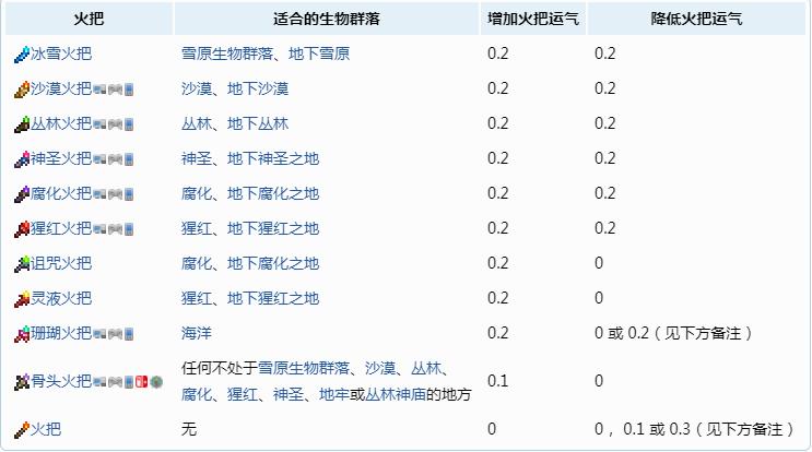 2.普通火把在沙漠、丛林、腐化、猩红和神圣生物群落中降低 0.1 的火把运气,在雪原生物群落中降低 0.3 。在任何其他地方都没有效果。
