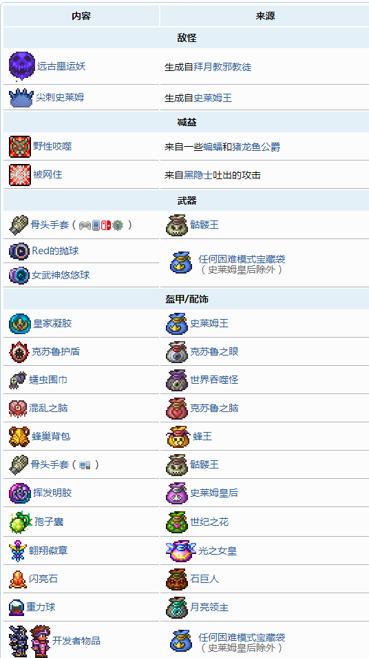 专家模式独有物品通过打开 Boss 掉落的宝藏袋得到,一般拥有稀有度。这些物品只能从专家模式的世界中得到,但它们在普通世界中也依然可以正常使用,除了恶魔之心。