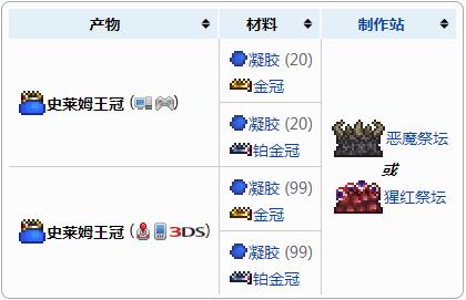 需要五个金锭\铂金锭,一个红玉,合成金冠\铂金冠,再用二十个凝胶在恶魔或血腥祭坛处合成史莱姆王冠