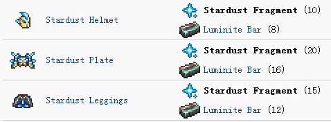 一,泰拉瑞亚召唤师毕业装选择星辰套。星辰套总防御增加38点,增加召唤伤害66%,增加5个召唤物。套装效果是召唤一个星尘守护者跟随你(双击下键可以传送你的守护者到前方敌人的位置)。合成方法也和之前日耀套星云套相似,45个星辰碎片,36个月光锭在远古操纵机处合成。