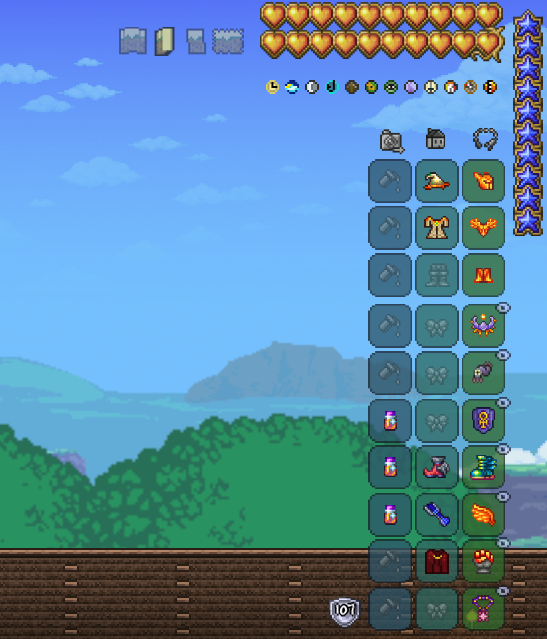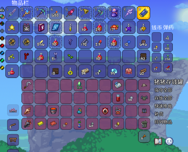 最先搞了泰拉靴,然后手机,渔夫套,十字盾这种也做了,NPC也全了。当然还有最最最关键的天顶剑,为了喵刀我刷了差不多50只月总啦!