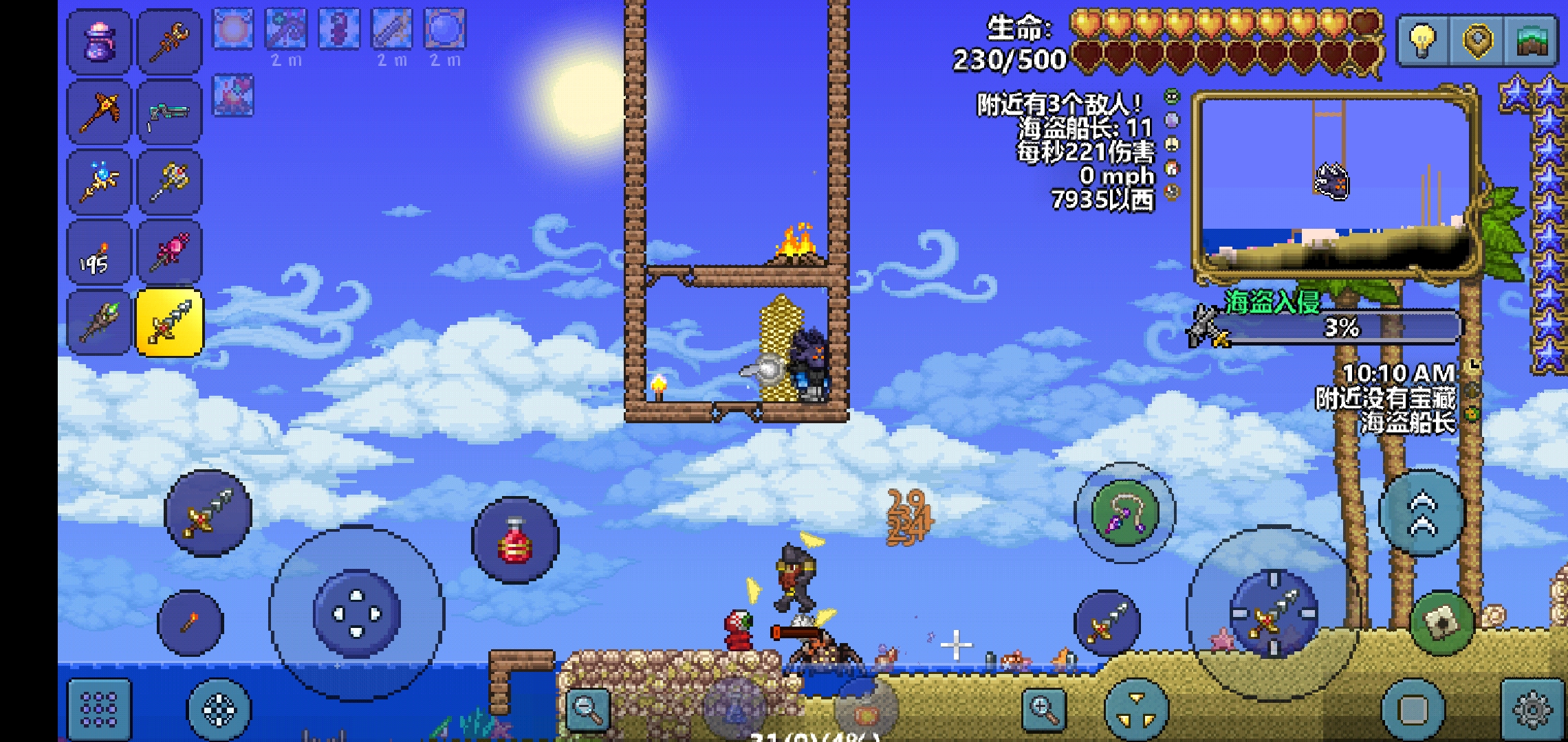 其次就是打boss海盗船了,你这个房子一定要足够高,这样海盗船就会被拦下,你在海盗船的位置敲开一个小洞,拿枪射击就行,海盗船打不到你,