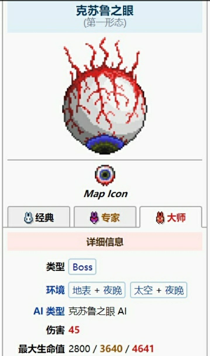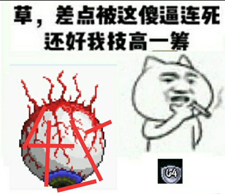 此时我的防御力是49,加上各种药剂(打大师难度要学会制作强力药💊剂,最好建个刷药厂,不然很难受)我的防御力是64,然后我们就可以拿着肉前最强的一套装备开始面对泰拉瑞亚大师难度的第一只boss。