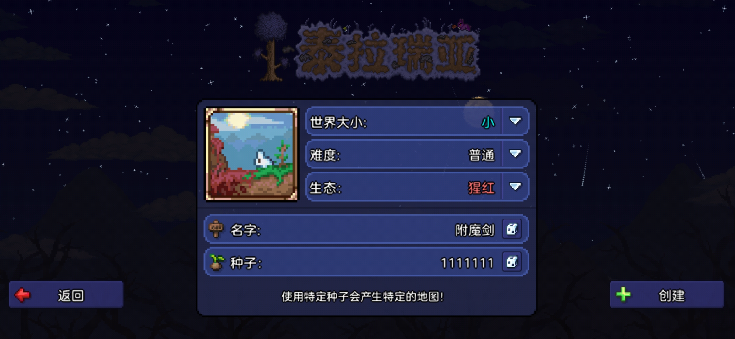 首先创建一个地图,地图类型为小、血腥之地,种子为1111111,名字为附魔剑