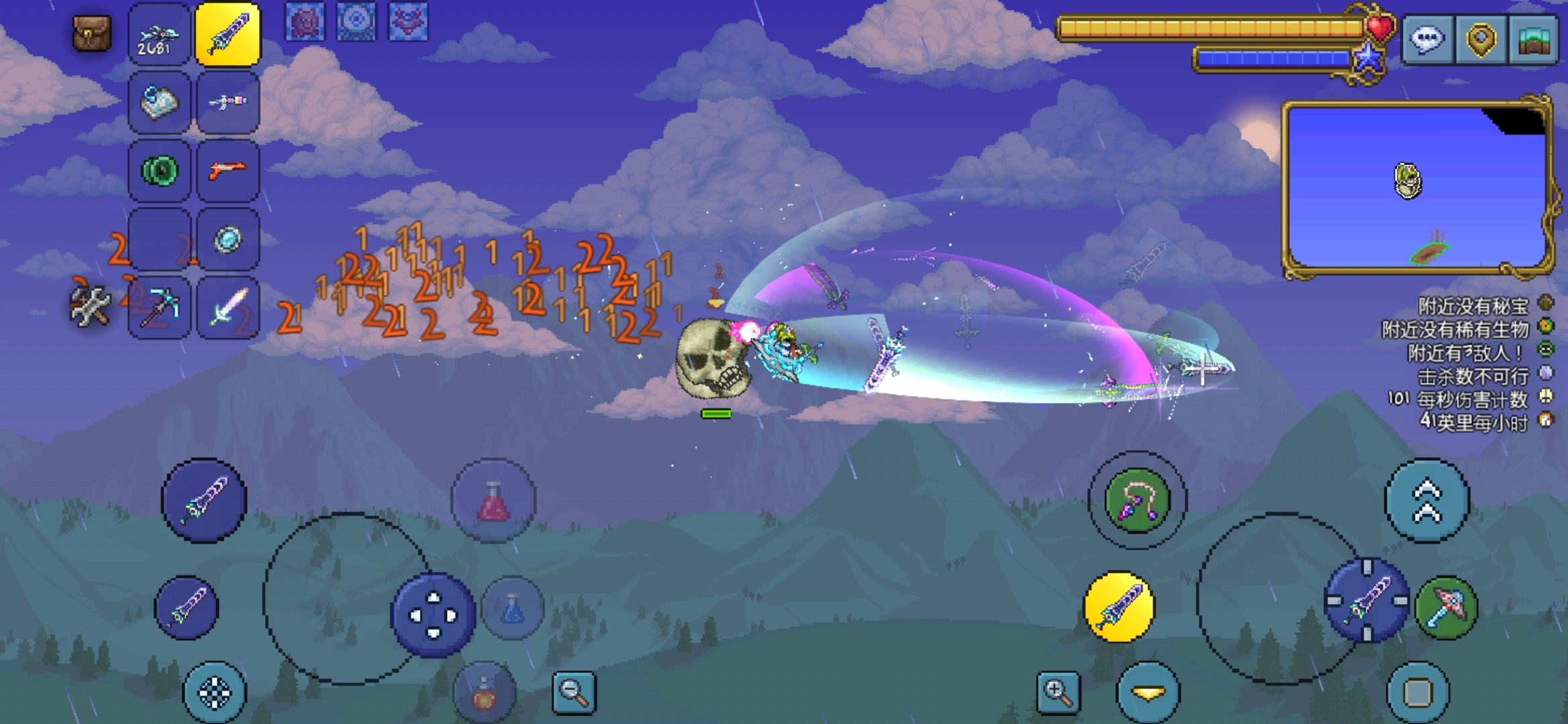 当时我想测试橙色冲击波能不能秒地守,这还是穿的陨石套打的,可以看到已经有一百的秒伤了,还不加召唤物,一会就能打赢地牢守卫