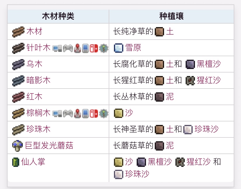 宝石树(种植壤为石头 。特别的,宝石树应用相对应的宝石果种植)和 竹子(种植壤为被水淹没的长有丛林草的泥,水至少两格浅最多五格深)不在上面表格中。因为宝石树的木材种类是石头(在砍伐时,类似于普通树木掉落种子,宝石树会掉落 0-24 个相应类型的宝石、0-11 颗相应类型的宝石果、和 7-48 个石块。 ),竹子需要用稿获取。