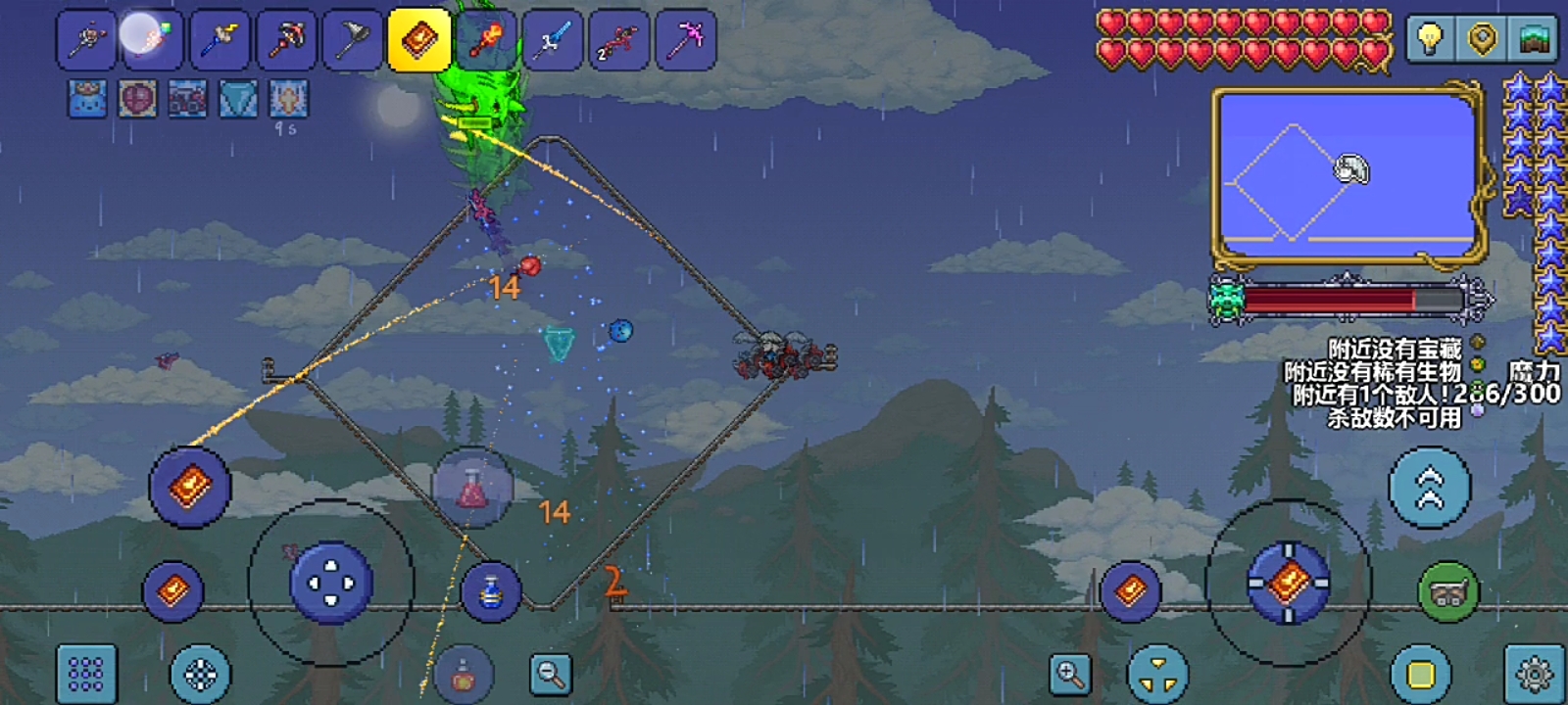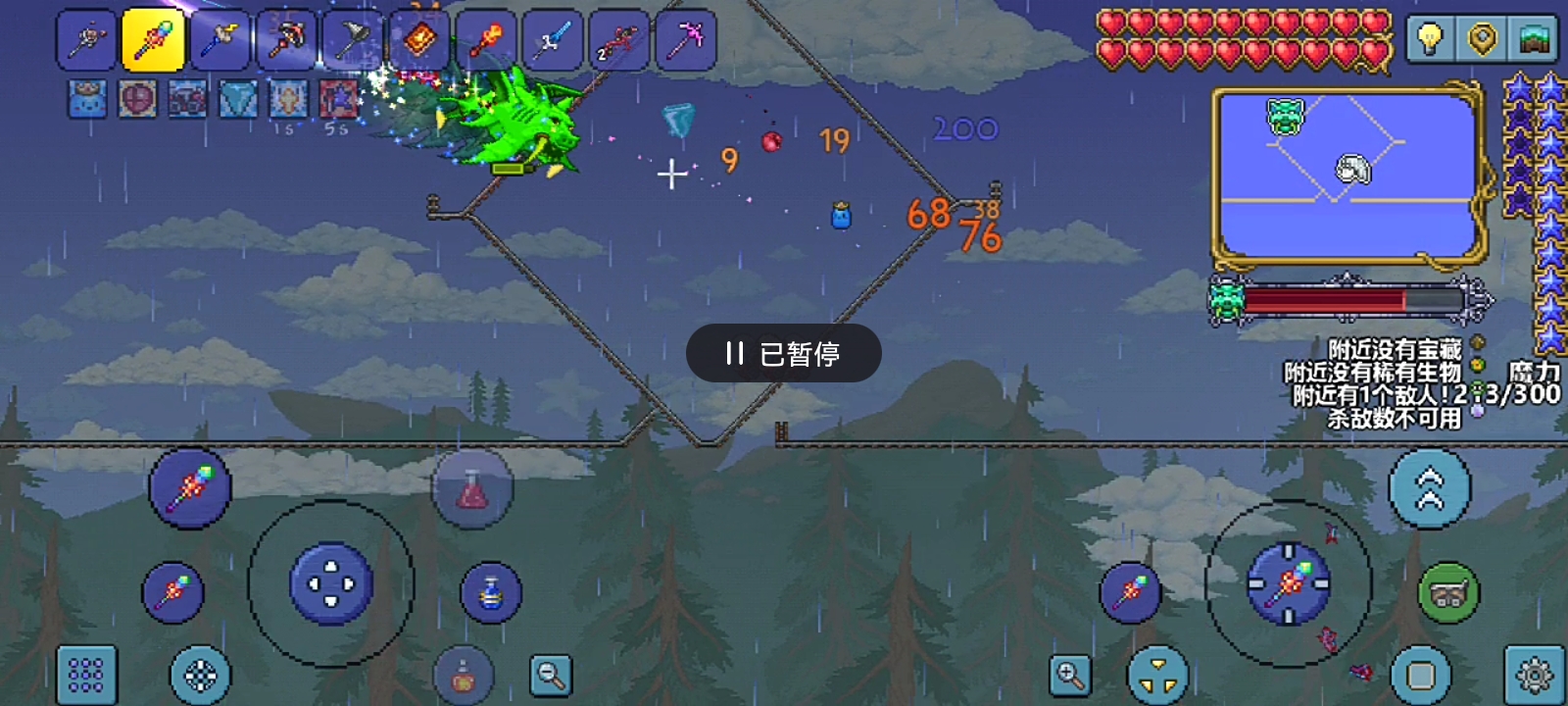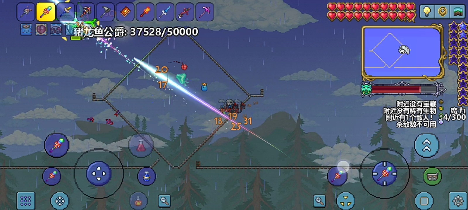 8当猪鲨进入第二阶段时他会原地待一会,这个时候一定要确保:法力够,没有debuff,猪鲨有灵液减防。然后用流星法杖疯狂输出(但也只有一两秒的样子)见最后一张图