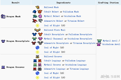 使用神圣套、枯萎之魂、力量之魂和肉山后新三矿的套装对应的部件在秘银砧/山铜砧处合成。