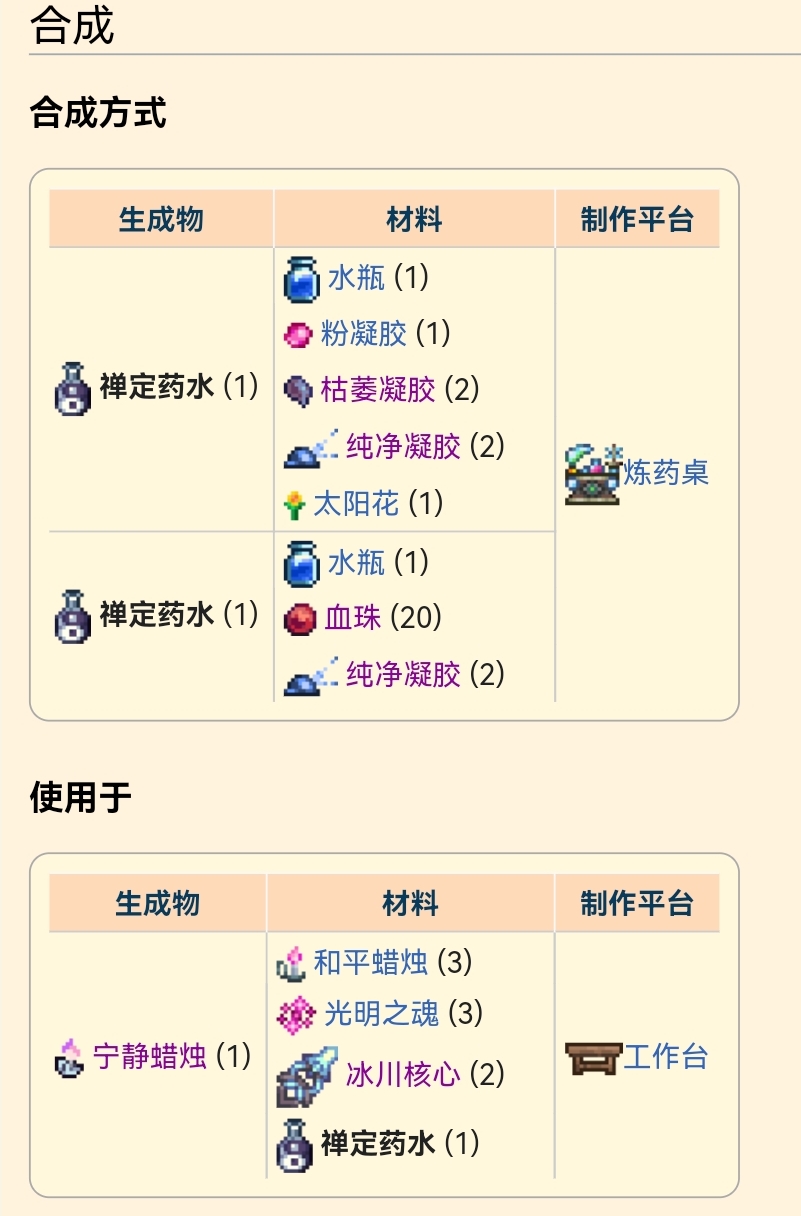 禅定药水是一个困难模式之前的,可制作的增益药水。使用后,玩家会获得禅定增益,降低60%敌怪刷新率和70%最大刷新量。它也可以用来制作宁静蜡烛。