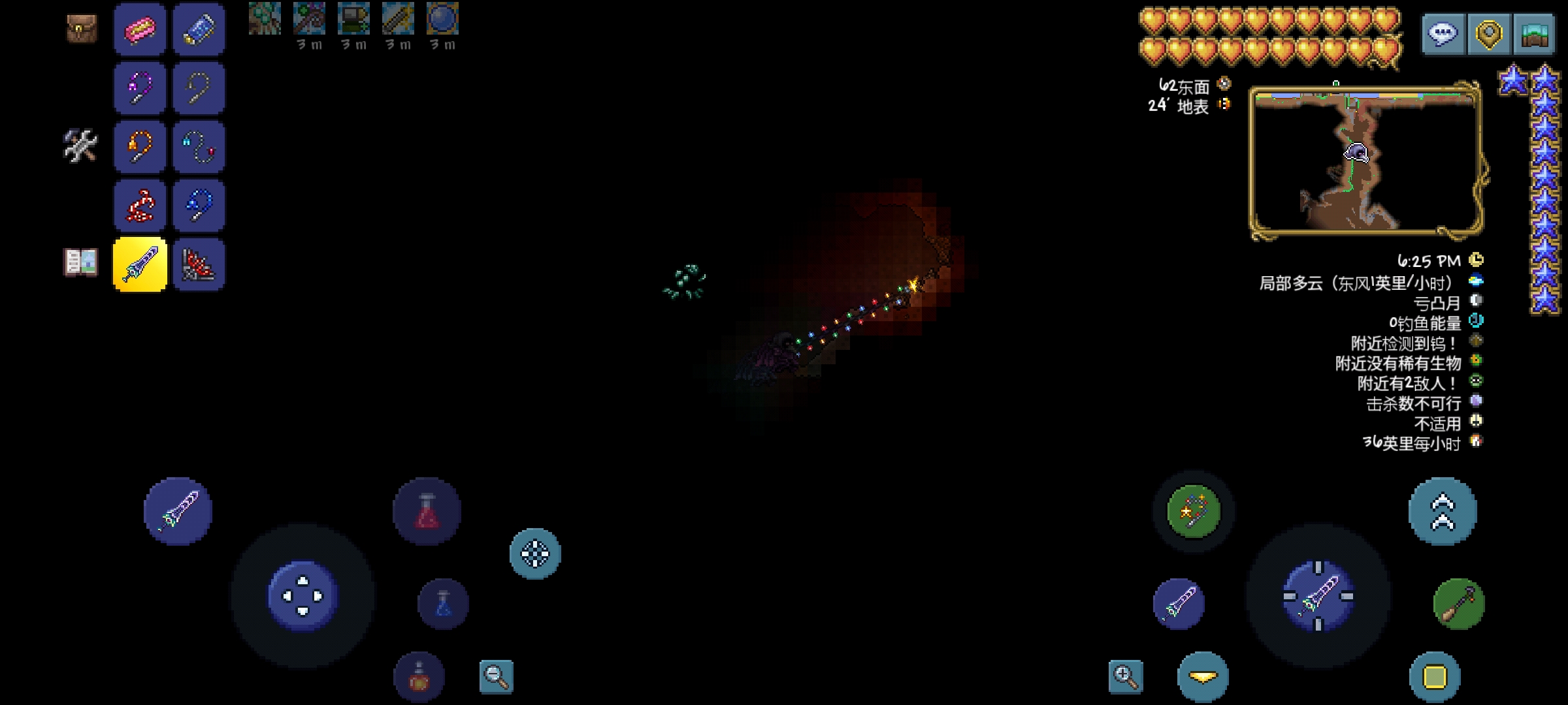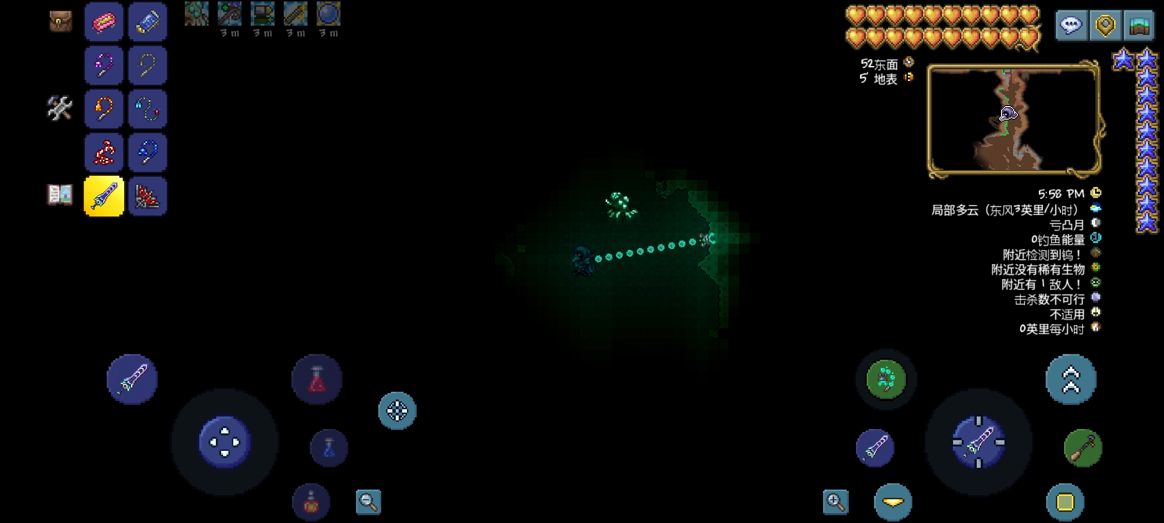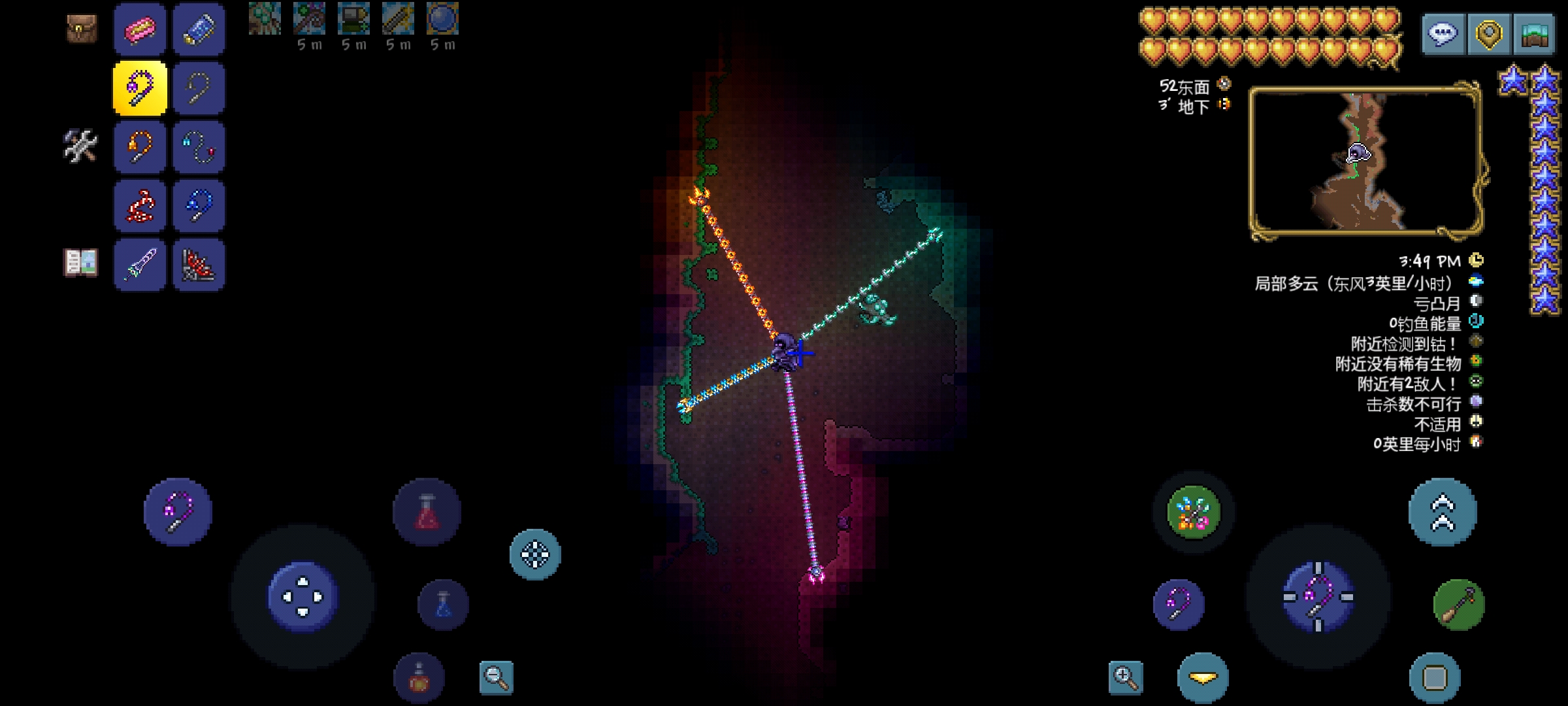 9.反重力钩:神奇的钩子,玩家勾住物块以后,可以绕着物块转圈圈,停留位置取决于移动轮盘所指方位,并且此钩也有照明效果