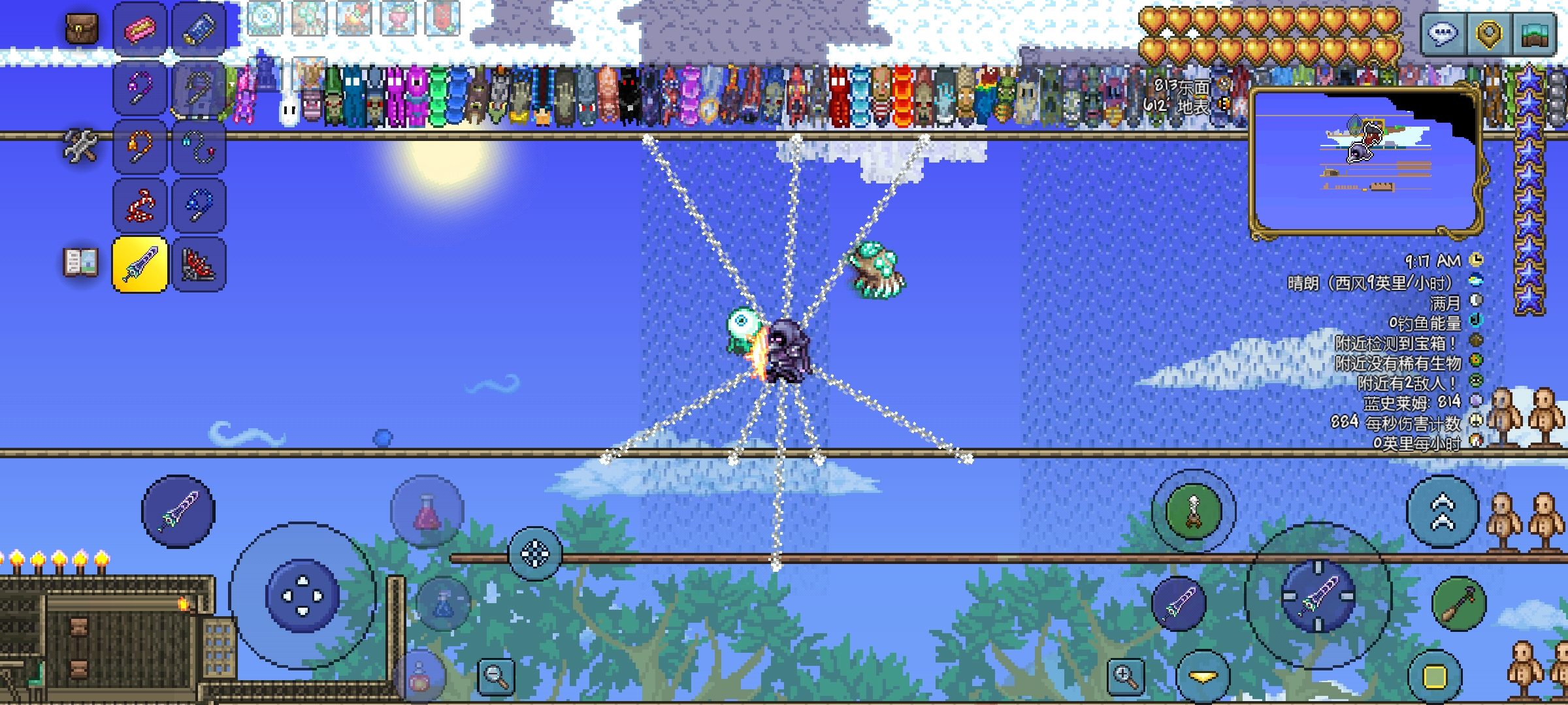 4.多钩:这里指可以存在多个钩爪但又没有特殊能力的钩爪,可以存在两个钩爪的骷髅王之手,可以存在三个钩爪的肌腱钩、蠕虫钩、阴森钩、刺钩、常春藤鞭、鱼钩、史莱姆钩,最后是可以同时存在8个钩爪的蜘蛛吊索(这里就只是展示蜘蛛吊索)