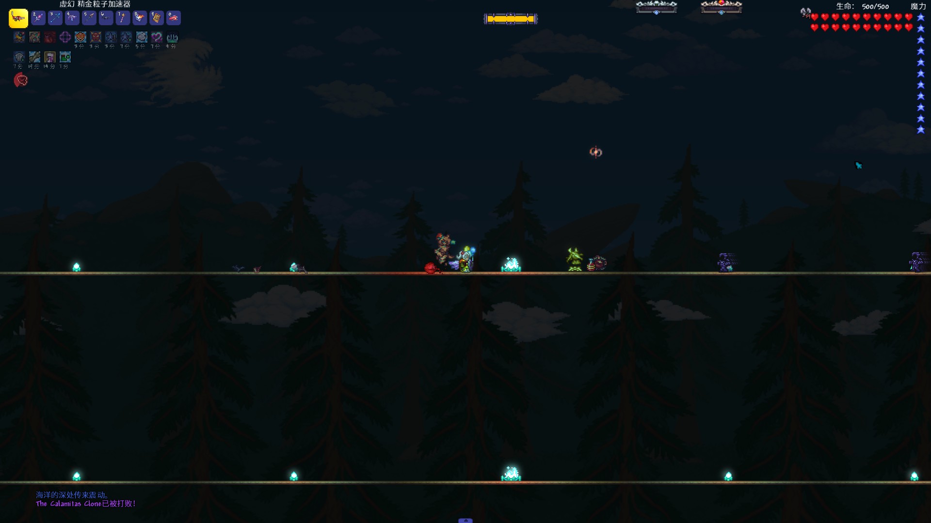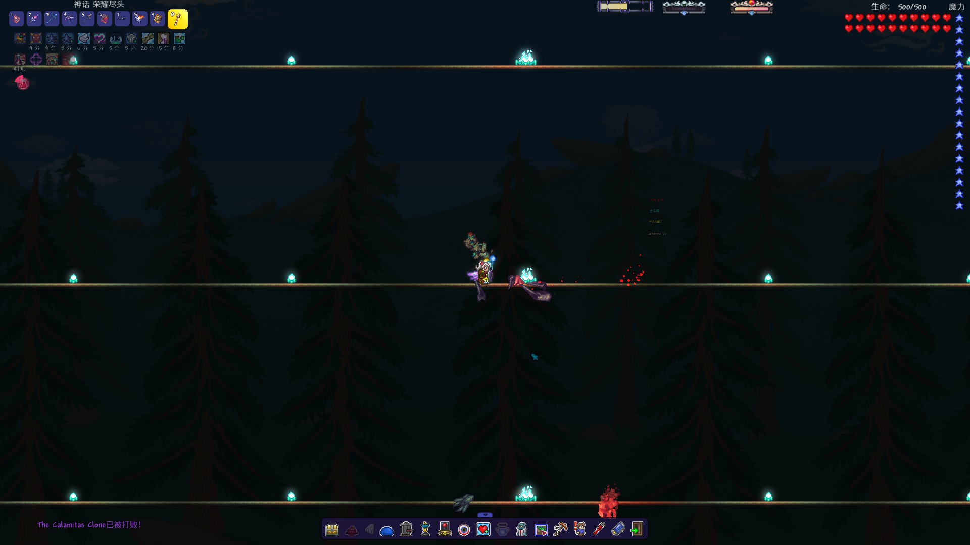 这次是打完灾厄之后,换了硫火套装,因为秘银套之后的盔甲伤害加成都没有秘银套高,减魔耗也没好到哪去,干脆就先做了硫火套重新打一遍,当然也差不多是那种情况,也是死了几遍,成功两次吧,因为灾厄最后阶段会一直冲刺并带有预判,冲刺过的地方还会留下弹幕,过几秒钟还会向你飞过来,好不容易才撑过弹幕炼狱,结果又来一个这种回合,老是死在最后阶段,第一次成功是攒了肾上腺素和愤怒条,直接两个采一起开把他秒了,不然真的撑不了几秒,第二次最后阶段换荣耀尽头,但是因为他有预判,而且因为留有弹幕他冲刺过的地方我过不去,总之也是很艰难的打败了它