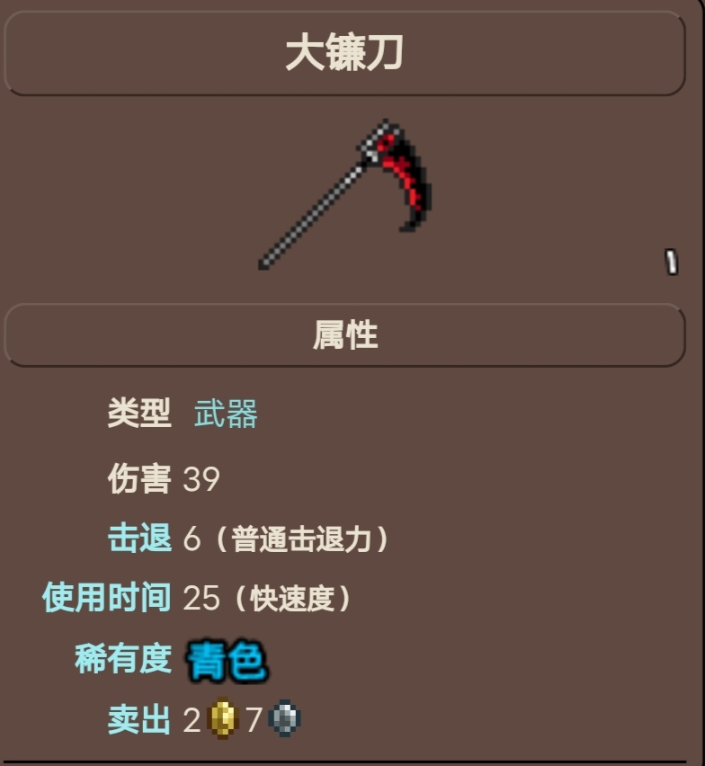 大镰刀是一种无法获得的武器,实际上并未包含在游戏文件。在1.2.4的更新中中完全删除了它。这把武器的原型参考了死神镰刀。如果调出会是天使雕像,类似霜之哀伤。