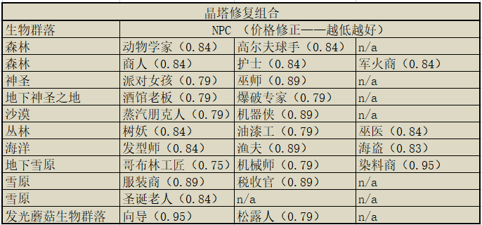 6.将服装商和税收官安置在地下雪原生物群落可以使服装商的价格修正从 0.89 降低至 0.84(-0.05)。但是,这将会移除唯一一个 2 名及以上NPC的地表雪原生物群落城镇,因此可能不这合放置晶塔。