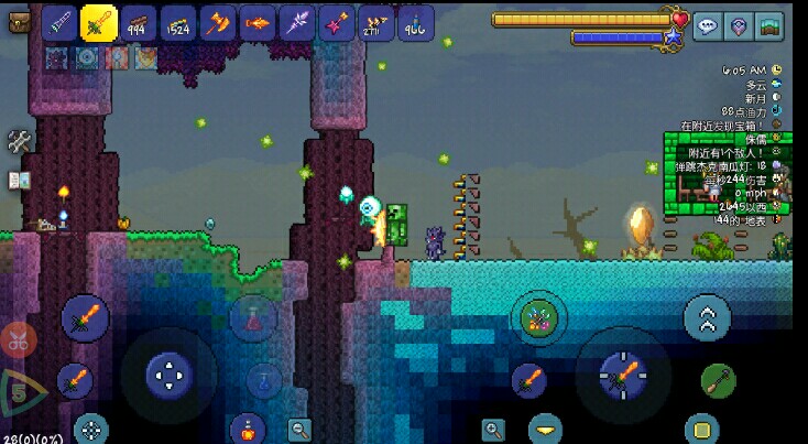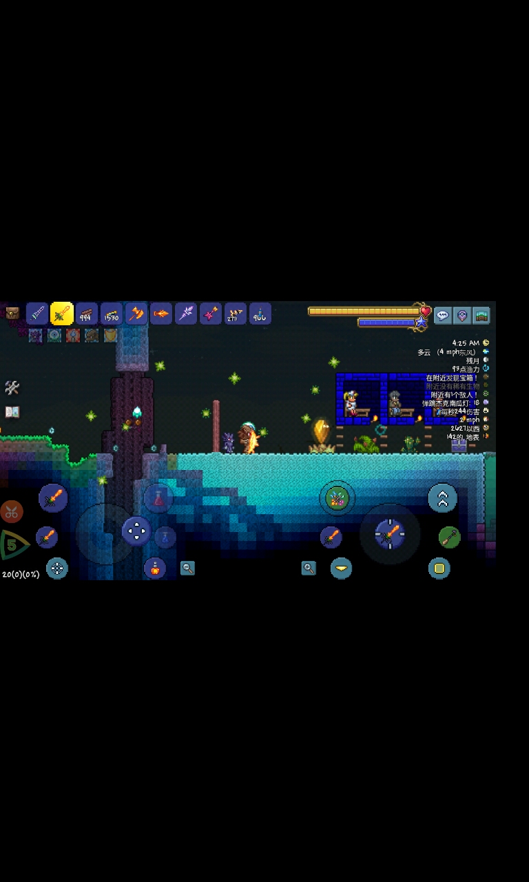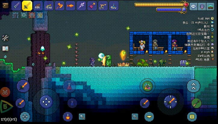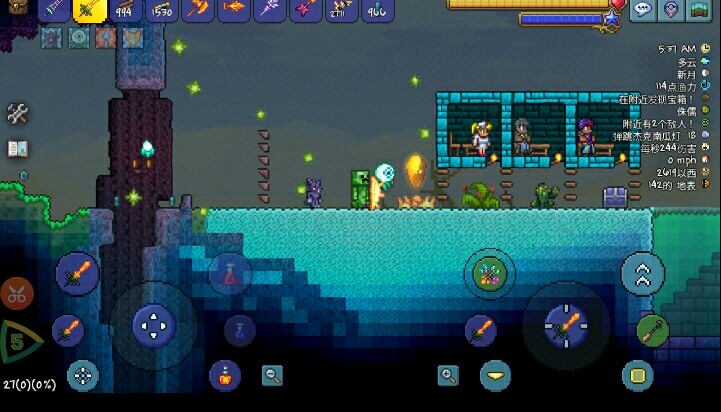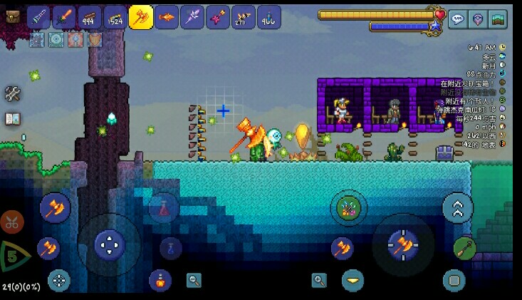 4.这时碰到平台你就会被推出去啦!利用这个性质可以抵御各种入侵事件,也可以在前期帮助新手玩家度过可怕的夜晚和血月啦!怪物永远不能靠近你!