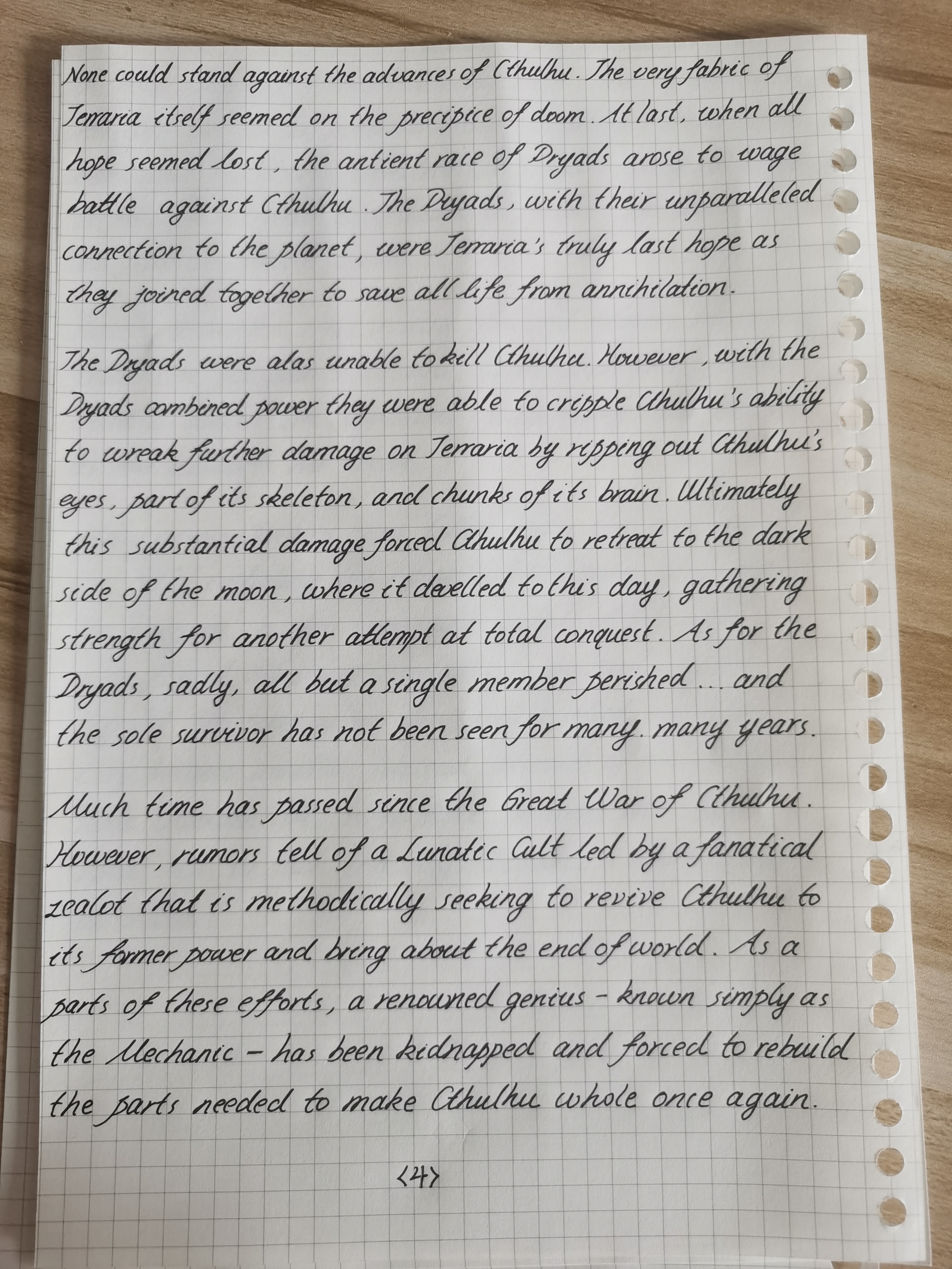 克苏鲁--一个有着无上力量和未知起源的存在,它们在很久以前来到你们的世界,似乎唯一的目的就是破坏并且支配你们世界上所有的生命。没有什么能阻挡克苏鲁进攻的脚步,泰拉世界处在了末日的边缘,一切希望都破灭之后,古老的树妖一族开始与其对抗,树妖们有着与大自然的完美契合,它们是泰拉世界的最后的希望,也正是因为他们,世界才免于毁灭。可惜的是,连树妖们也无法杀死这强大的外神,但在树妖们集结的力量之下,它们极大地限制了克苏鲁的能力,它们挖出克苏鲁的眼睛,扯出它的一部分骨架和一片大脑。最终这严重的创伤使得克苏鲁不得不撤退到月球的黑暗面……直到今天,它依然沉睡那里,为最终的进攻积蓄力量。不幸的是树妖一族,仅仅留下了一个幸存者......而这唯一的幸存者也已经很久没有出现了。