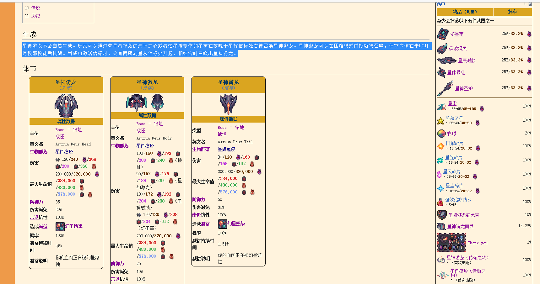2.【星神游龙】....它也不见啦。在【星辉信标】用泰坦之心召唤,出来的就一个头,而且只有一滴血,我都给所有召唤物收了,狱火特斯拉也关了,结果还是撞身上自己没了。。无语的,打了六十多个泰坦之心用的剩不到30都没召唤出来这星神龙。(附官方wiki【星神游龙】截图)