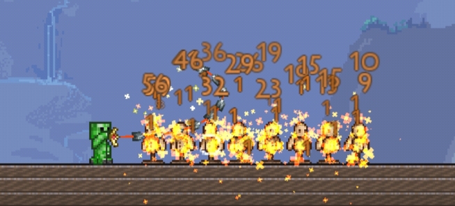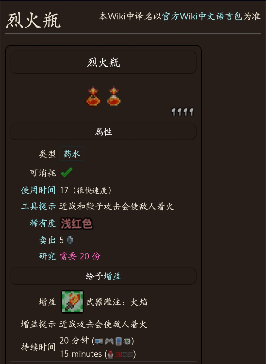 烈火瓶是一种会使近战武器造成着火了!减益的瓶子。在电脑版中,此效果并不会在死亡时消失。