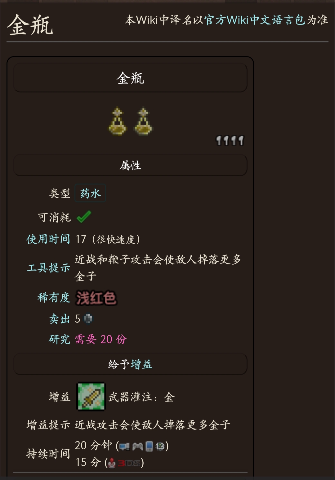 金瓶是一个由灌注站制作的药剂,它能提升怪物掉落的钱币。使用它之后,近战(和鞭)攻击怪物会给他们加上一个迈达斯的减益效果,当他们死亡后会多掉落 10%~50% 的钱币。