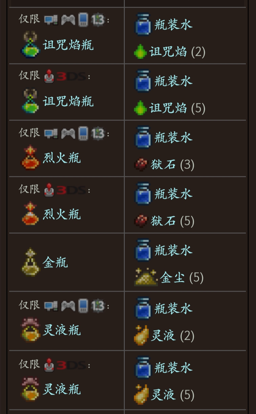 虽然在困难模式之前就可以购买灌注站,但大多数药剂都需要困难模式材料。只有毒药瓶、派对瓶、和烈火瓶可以在困难模式之前得到。