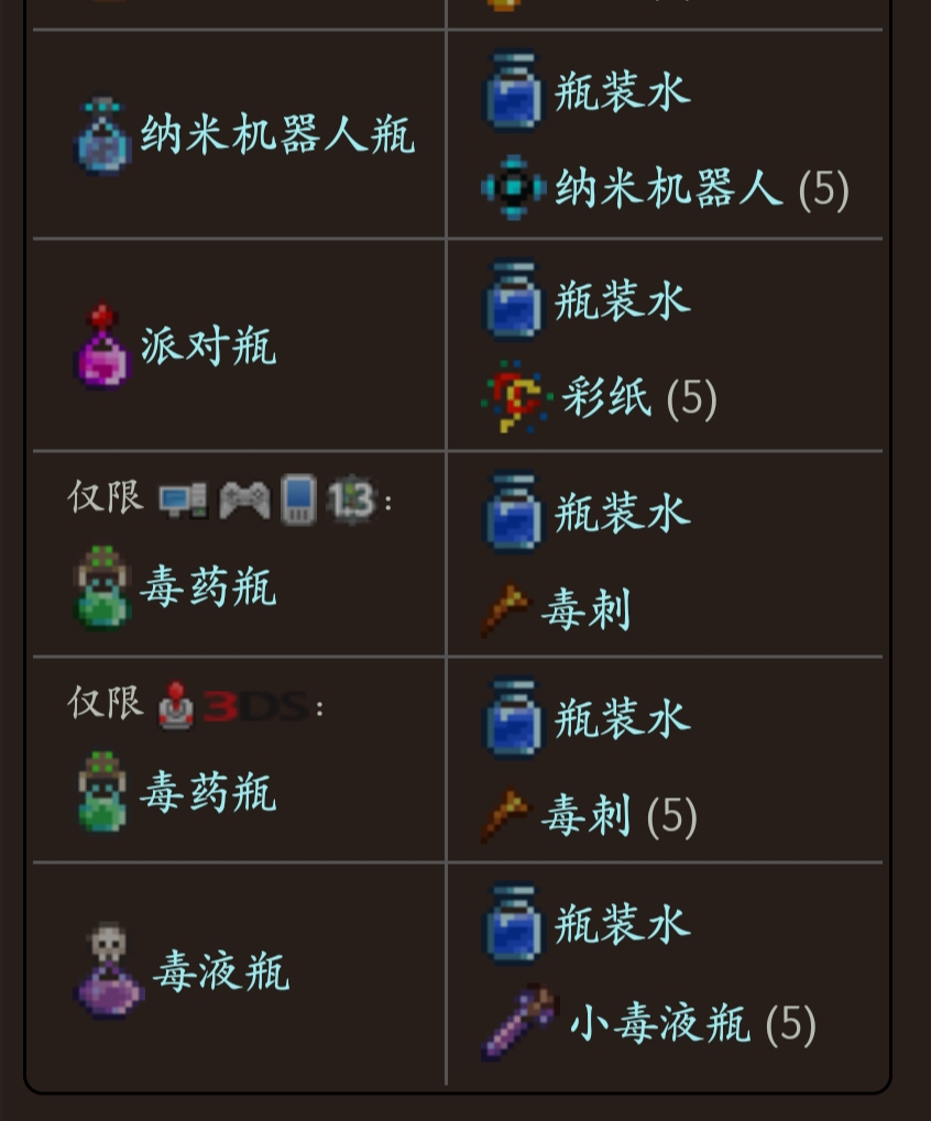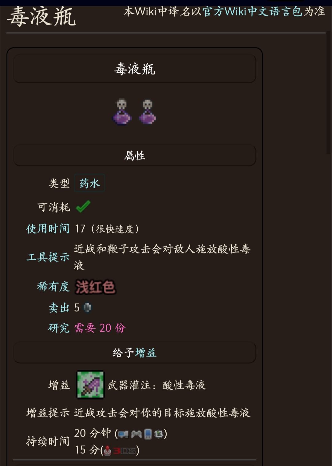 毒药瓶不能和其他药剂共同使用,使用它会移除任何现存的瓶子效果。此物品目前在 PvP 场景中不会应用减益。