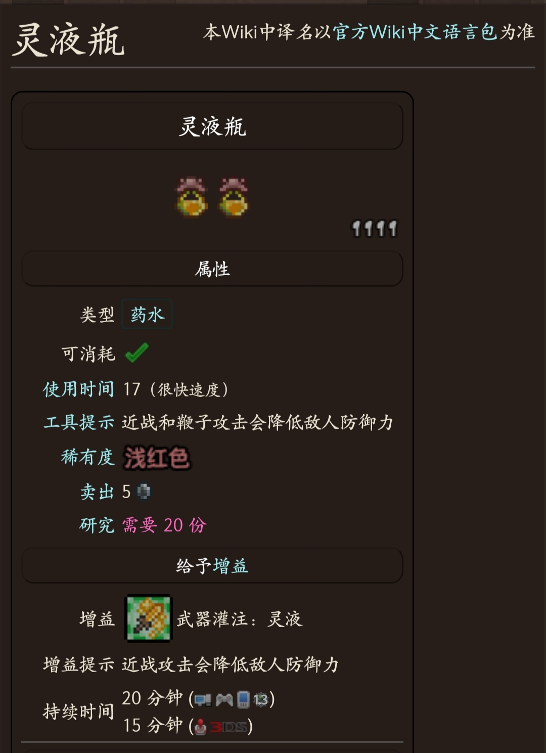 灵液瓶是一种困难模式的瓶子,在灌注站制作。在灵液瓶的影响下,近战和鞭攻击会造成灵液减益,持续 10 到 19 秒,使敌怪的防御降低 15(电脑版,主机版和移动版) / 20(3DS版和tModLoader旧版本),从而使玩家的武器伤害提高 7-8 (电脑版,主机版和移动版)/ 10(3DS版和tModLoader旧版本)。