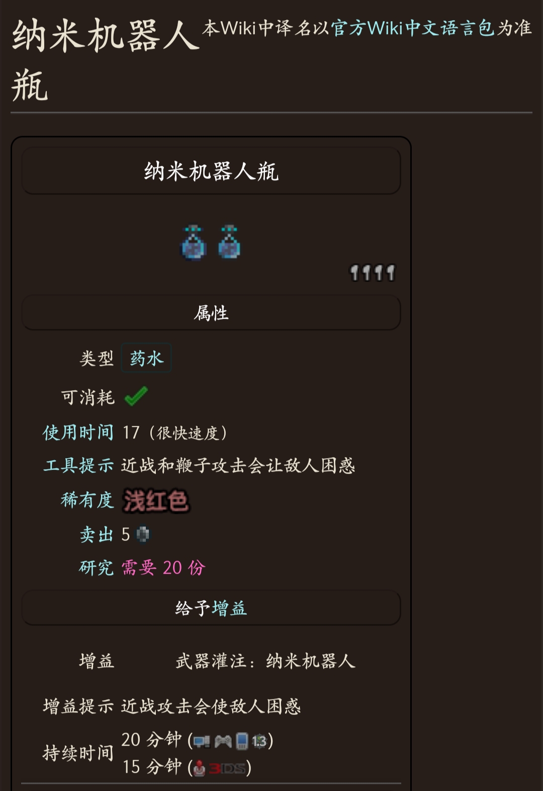纳米机器人瓶是一种困难模式、世纪之花后的瓶子,会导致玩家的近战(和鞭)攻击能对敌怪造成困惑减益。对于控制大群敌怪很有效,并且能降低世纪之花后的地牢和丛林神庙的难度。(但所有boss免疫困惑减益)