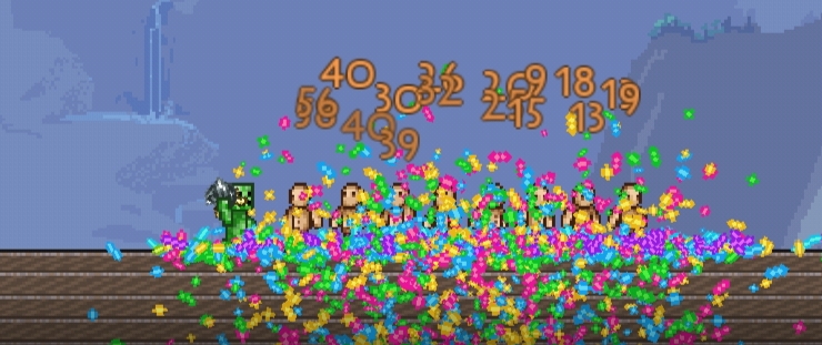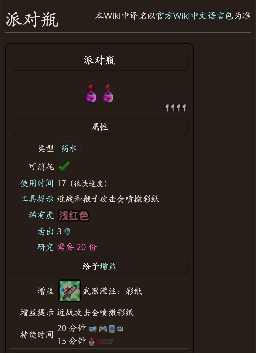 派对瓶是八种药剂中的一种,饮用后会提供近战(和召唤)“奖励”。这种瓶子会提供一种增益,使得玩家在使用近战武器或鞭攻击时会产生彩纸。这会持续 20(电脑版,移动版,主机版和tModLoader旧版本) / 15 (3DS版)分钟,但任何时候都可以通过右键点击图标(电脑版和tModLoader旧版本)、通过在装备菜单中选择图标并取消之(主机版和前代主机版)、通过双击增益图标(移动版)、或通过在增益屏幕取消增益(3DS版)来取消。产生的彩纸是纯粹视觉性的,不会提供伤害奖励。