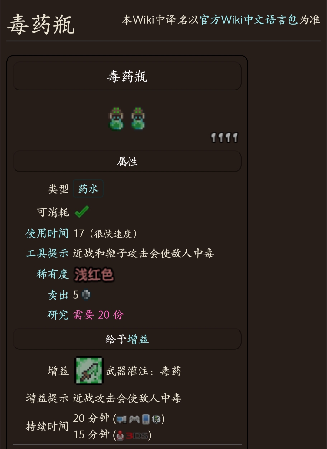 毒药瓶是一种瓶子,让任意近战武器或鞭能造成中毒减益。在电脑版、主机版、移动版、和tModLoader旧版本上,此效果在死亡时不会消失。