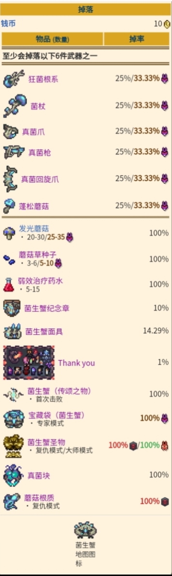 在每次跳跃攻击的最后一次跳跃中会在菌生蟹上方56.25格召唤出20个均匀分布的真菌孢子弹幕墙。