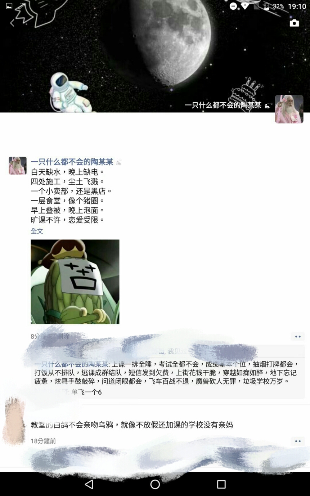 我是真的会谢 一只什么都不会的陶某某 我与神明画押,我赌他母傻x 馆友们,我已经撑不住了,甜甜的我们学校提前一个月上课,现在还没放,明天还要上课。我只是一个初三学牲QAQ,别人一个星期上五天课,我们一个星期上21天课(无中断),我真的撑不住了。愿我们还能再相见满鼻子怨气 评论({{ count }})条 只看作者 {{ form.sort_type == "desc" ? "最新" : "最早" }} 简单说两句... 发表 {{ item.user_detail["nick_name"] }} {{ item.user_detail["title"] }} @{{ at_user.nick_name }} {{ parseTime(item.add_time) }} 来自{{ item.from_region || item.user_detail["city"]||"未知" }} {{ item.user_detail['tail'] || "" }} 回复 {{ item.childs?.length }} {{ item.collect_count }} {{ item.like_count }} {{ comment_child.user_detail["nick_name"] }} @{{ at_user.nick_name }} {{ parseTime(comment_child.add_time) }} 来自{{ comment_child.from_region||comment_child.user_detail['city'] || "未知" }} {{ comment_child.user_detail['tail'] || "" }} 回复 {{ comment_child.like_count }} {{ comment_child.collect_count }} [加载更多] [折叠] 📢 暂无内容 [加载更多] 简单说两句... {{ count }} - - 🤔 ⬆️ ↪️ 回复 ⭐️ 点赞 ❤️ 收藏 ❗️ 举报 ⛔️ 删除 回复 发表 MD内容 图片 视频 表情 @馆友 发表 提到 等 {{ activeAtIds?.length }}人 {{ item.title }} {{ item.nick_name }} 请输入MD格式的内容