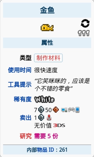 金鱼为游泳AI,稀有度为白色,最大堆叠为9999,在主机版,电脑版,移动版可卖出7银币50铜币,3DS版中则无价值,研究需要5份,可以噶50个获得旗帜