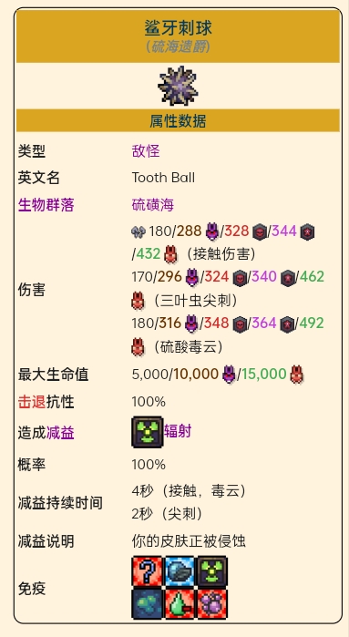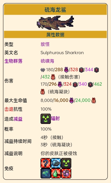 当硫海龙鲨被击败或击中方块时,会爆炸出两个硫海凝块 。硫海凝块会造成3秒的辐射减益。