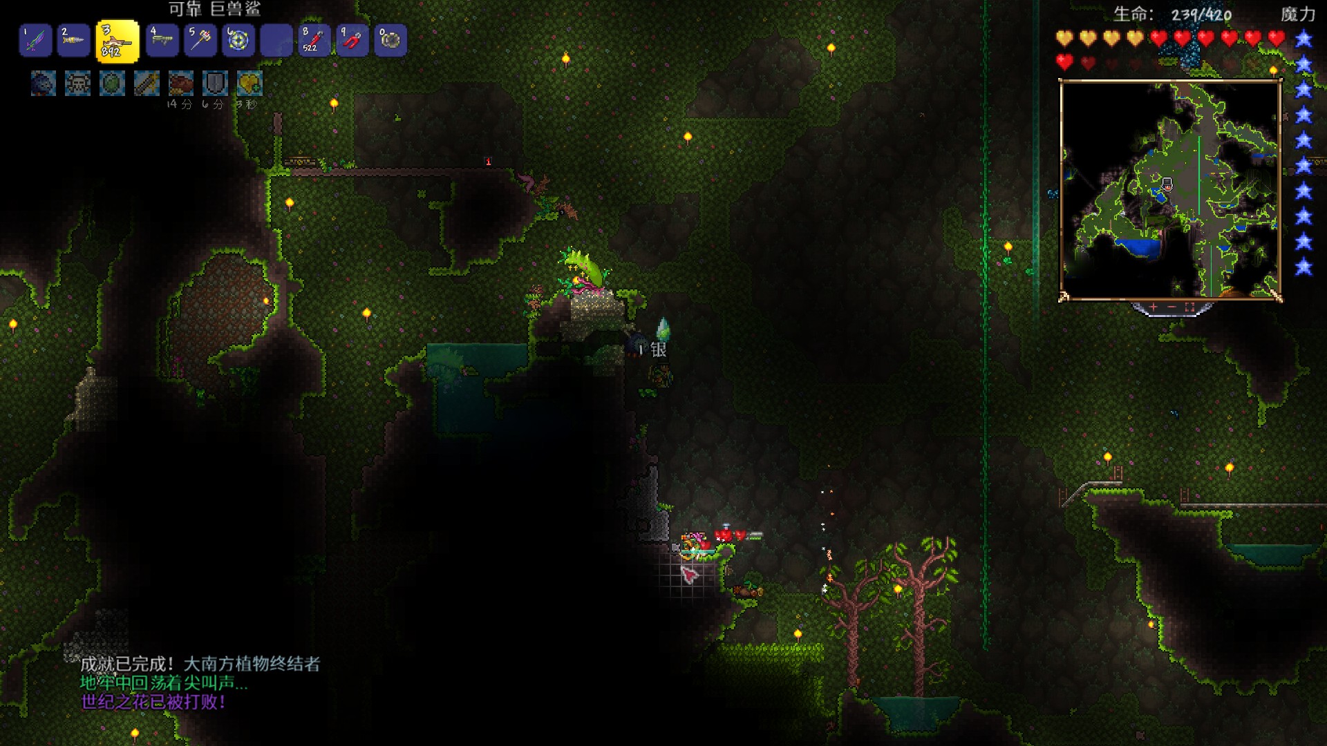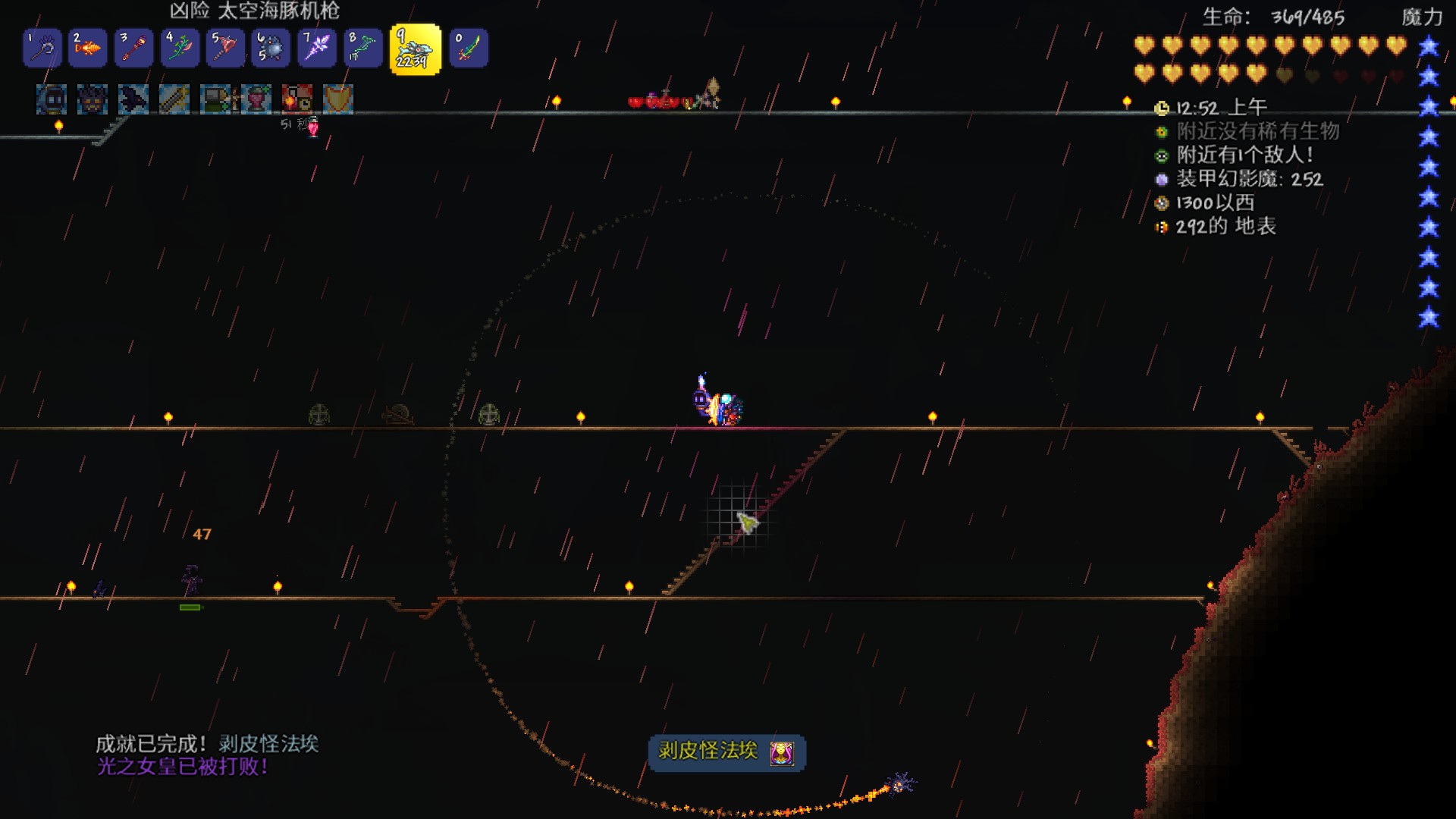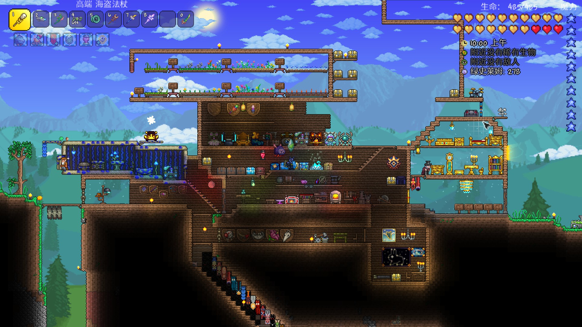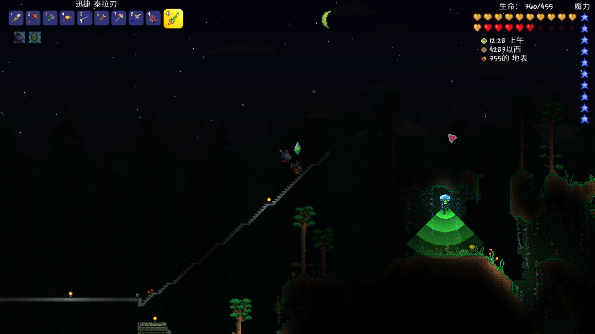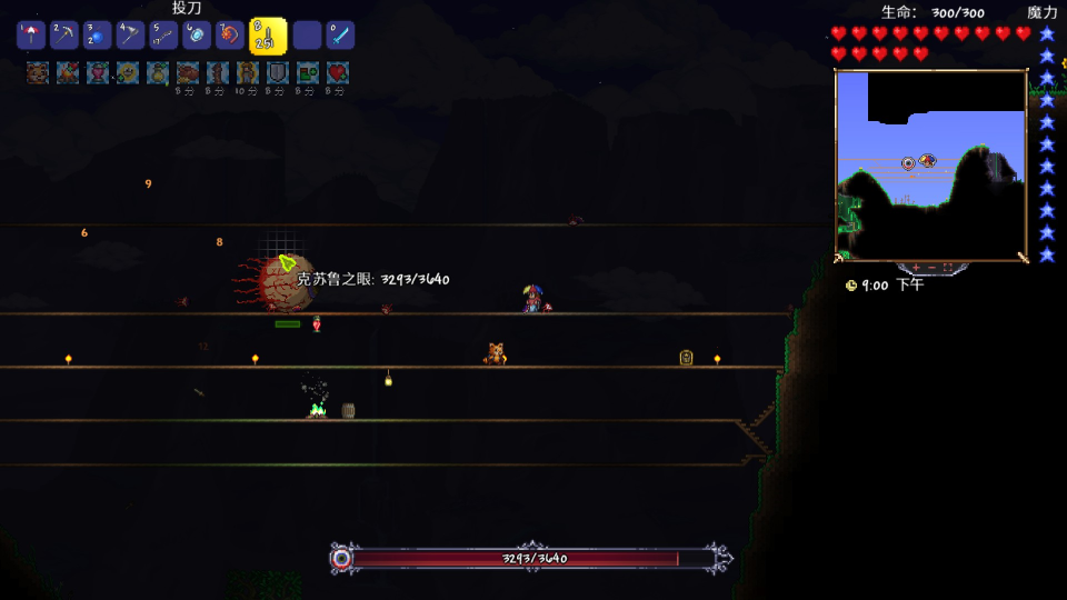 从克苏鲁之眼身上获得的魔矿还不足以推进我的进程。我继续深入丛林提高血量上限,制作防御力更上一级的丛林套。获取贵金属制作盔甲虽然行之有效,但这不免耗费太多时间。史莱姆坐骑也是我钟爱的装备。在我闲暇之余,我击败了史莱姆之王......对,我召唤出来的,我没空等史莱姆雨。