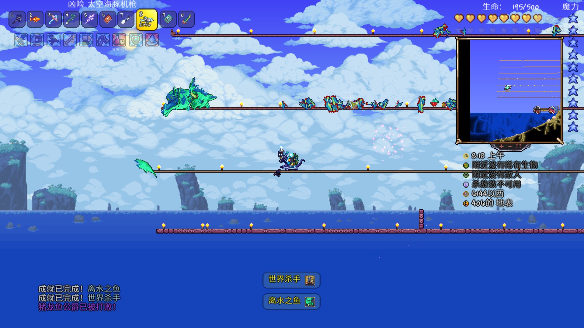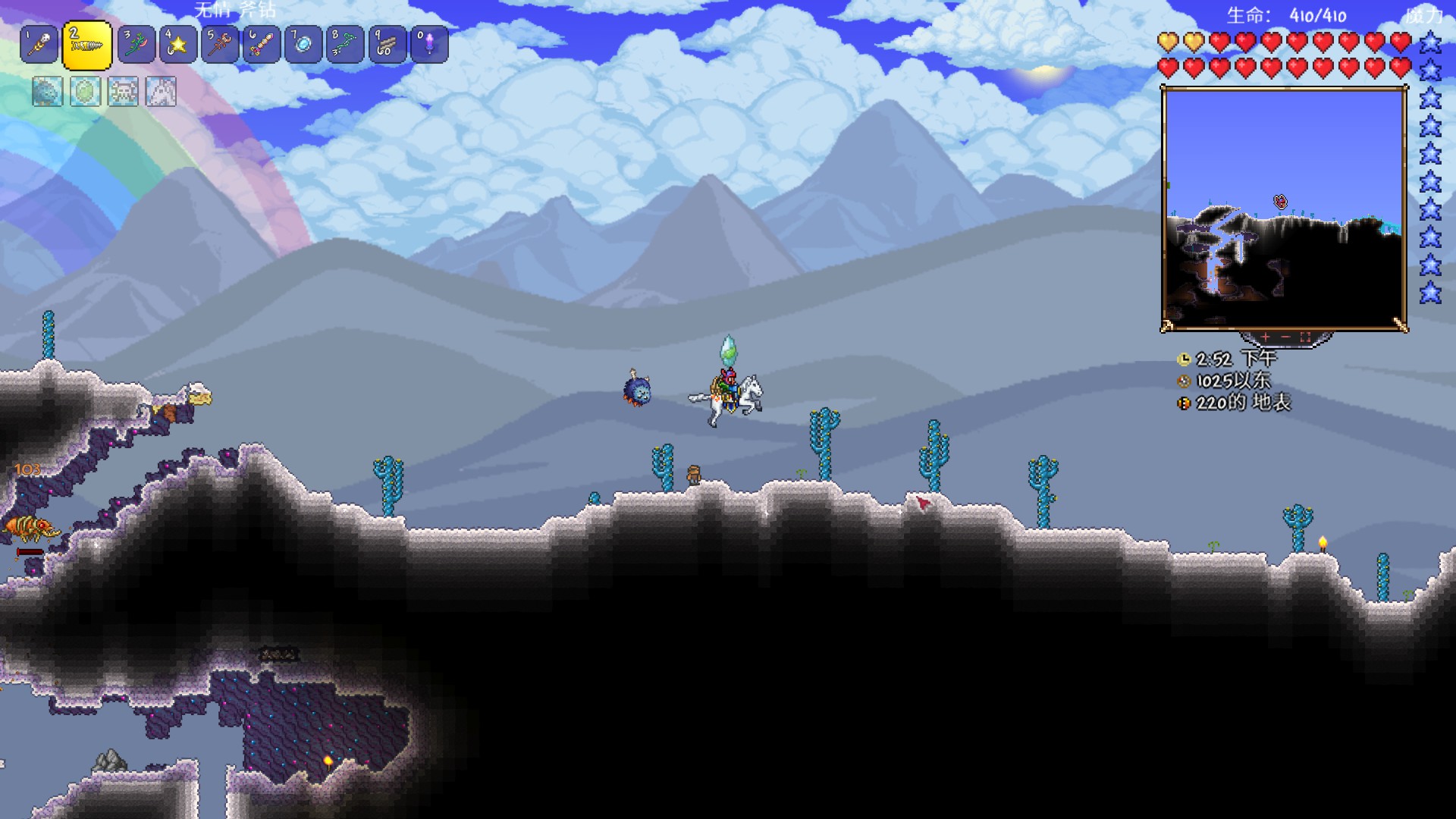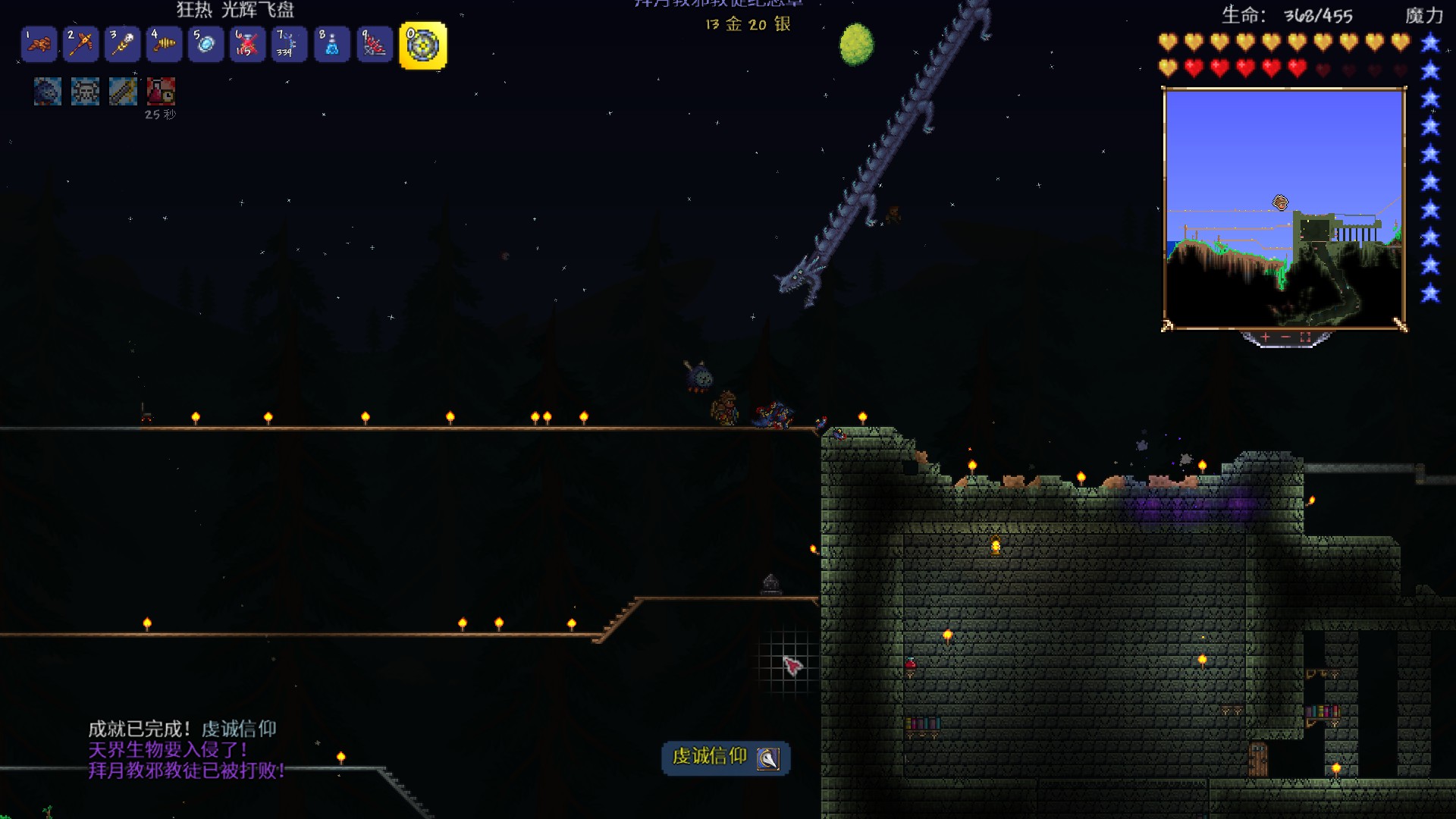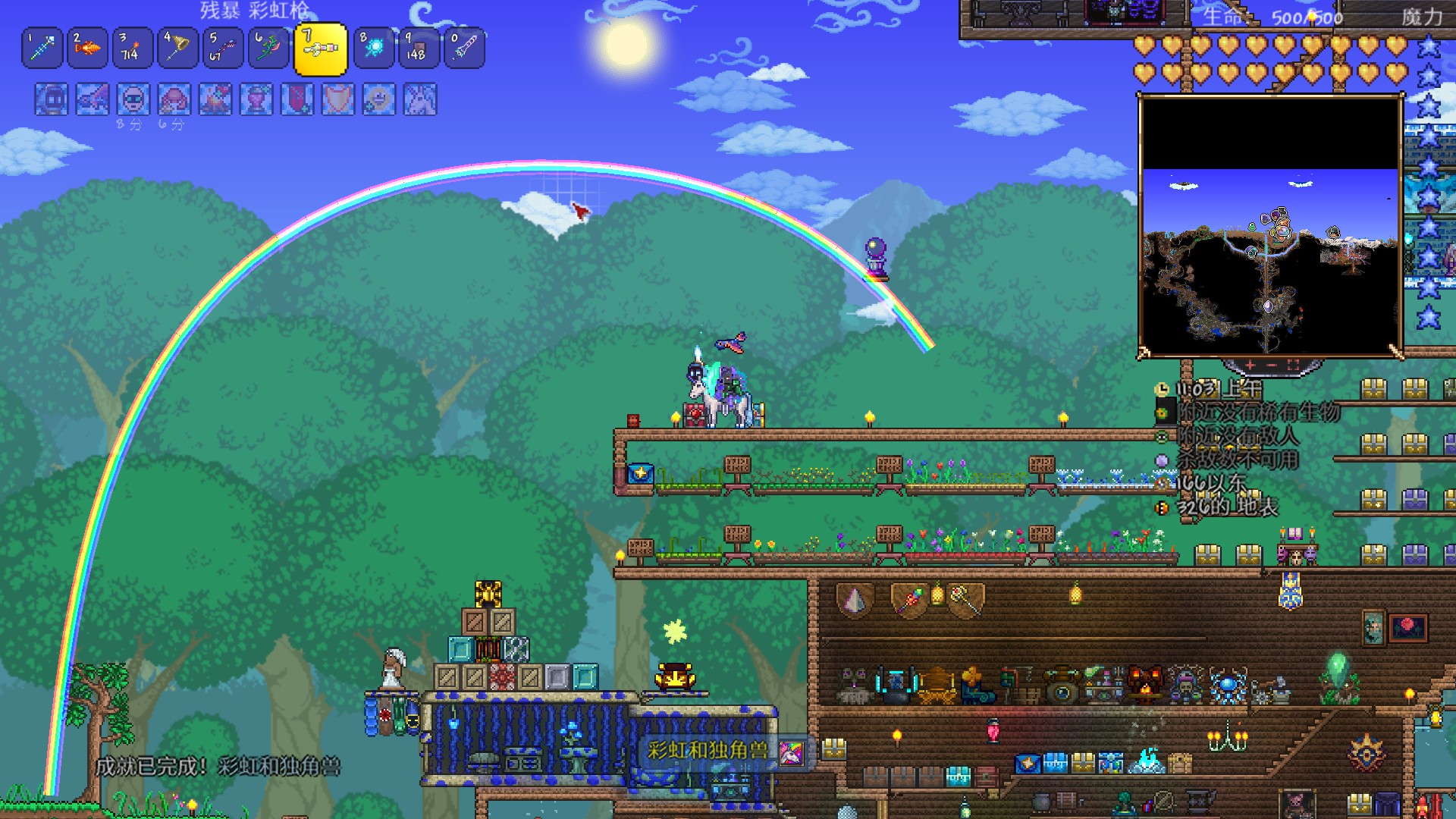从克苏鲁之眼身上获得的魔矿还不足以推进我的进程。我继续深入丛林提高血量上限,制作防御力更上一级的丛林套。获取贵金属制作盔甲虽然行之有效,但这不免耗费太多时间。史莱姆坐骑也是我钟爱的装备。在我闲暇之余,我击败了史莱姆之王......对,我召唤出来的,我没空等史莱姆雨。