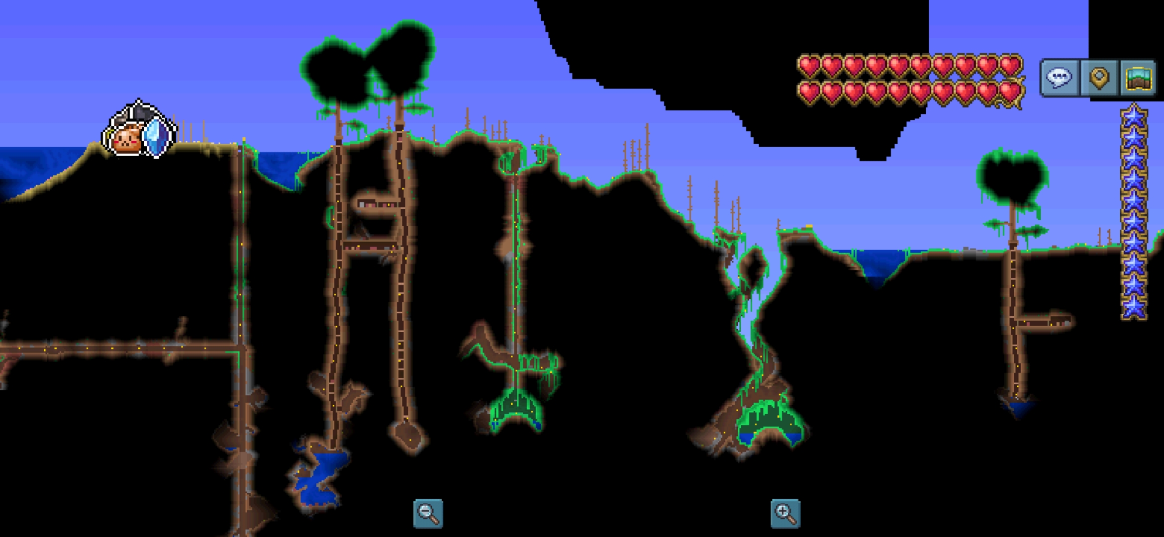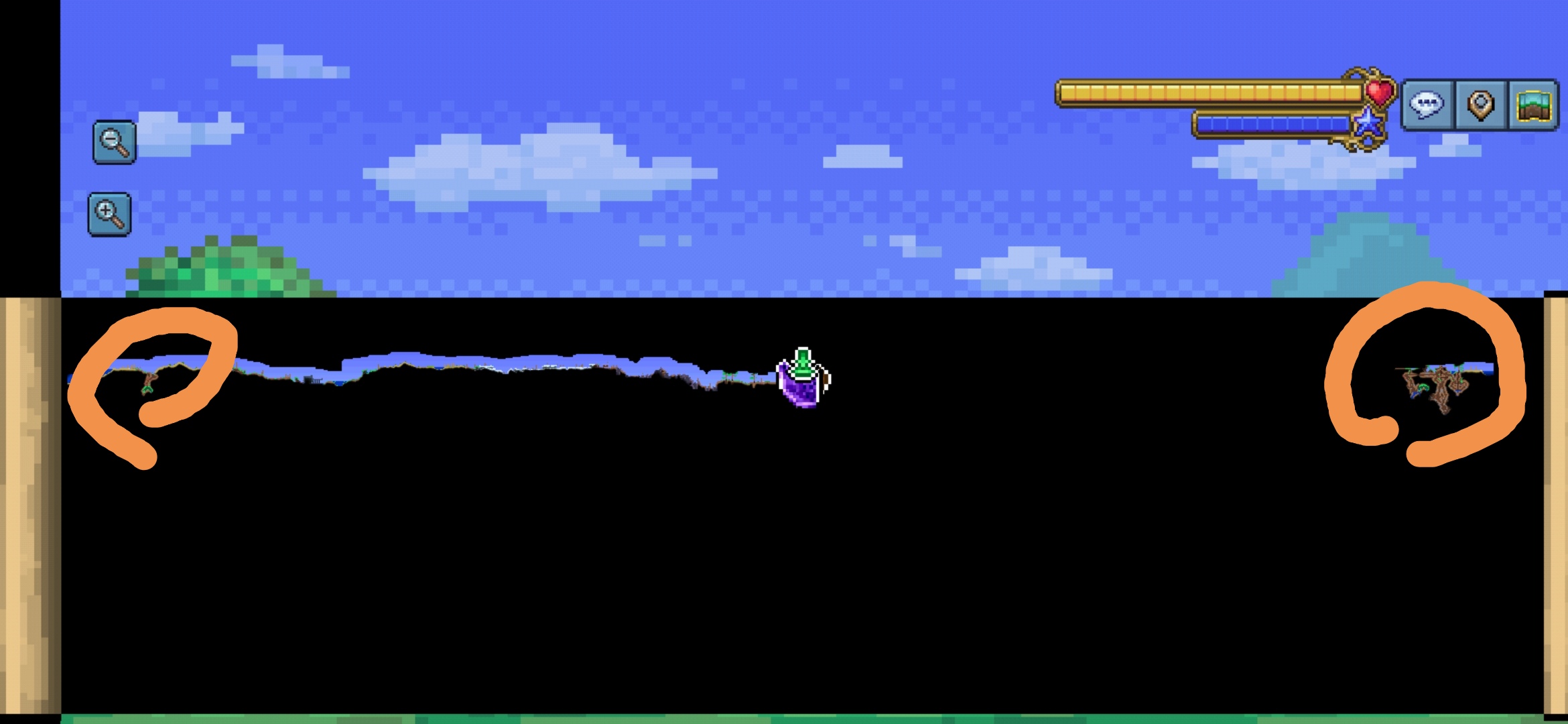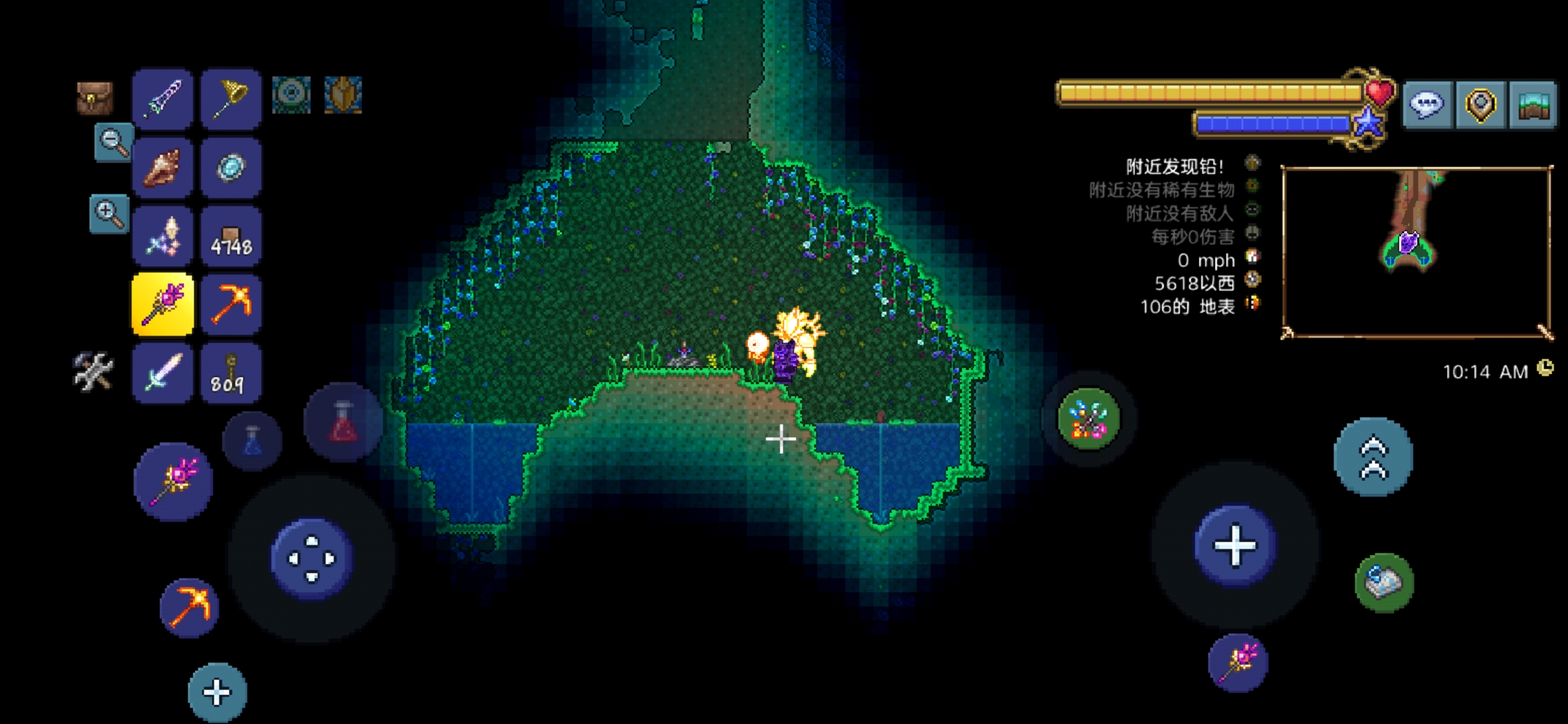 但是没有太大关系,因为出生点往右就有生命树,生命树下是废弃小屋,而更右边的沙漠有裸露在地表的金字塔,里边有个飞毯可以飞过腐化(如果运气够好,这个生命树和金字塔可以形成天然隔离带,我就刚好这样)