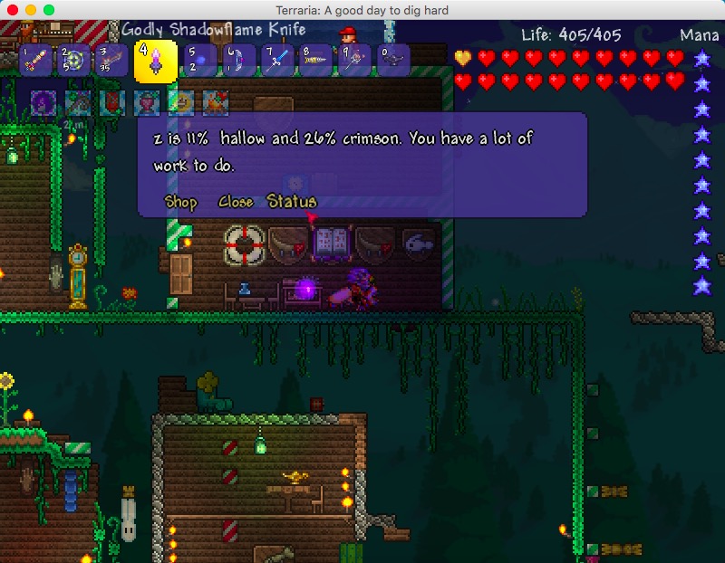 真不错,多么令人惬意(bushi)有点淡淡的悲伤,不想下矿,地下全是是蜘蛛巢,我有点蜘蛛恐惧症。出门即时猩红以及一大堆小可爱,丛林完好无损,可气的是,r人家怕丛林没了,我这不知道怎么回事,地下丛林在我家下头也开始蔓延。所以,我叶绿农场旁边有蘑菇,猩红,洞穴,丛林,蜘蛛巢,左边还有神圣,这图是不是废了,猩红已经无可救药,世花花苞也不见,小地图上找不到,郁闷郁闷
