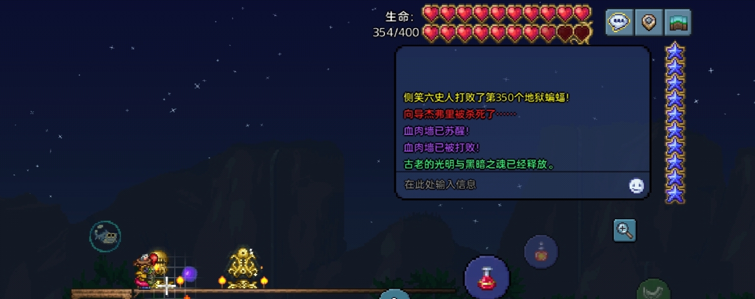 最后月亮领主,毕业boss,这里射手使用逃课法,无限悬浮板、叶绿弹,从召唤出来一直往单方向移动,叶绿弹自动索敌不用担心打不出伤害,来回往复,一两个世界横向路程就能刷完。