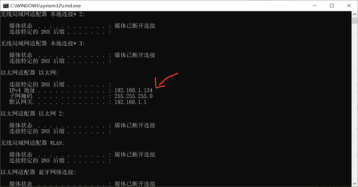 按win+R键打开运行窗口,输入cmd后回车,打开的窗口输入ipconfig来显示出自己的IP地址注意是IPv4。