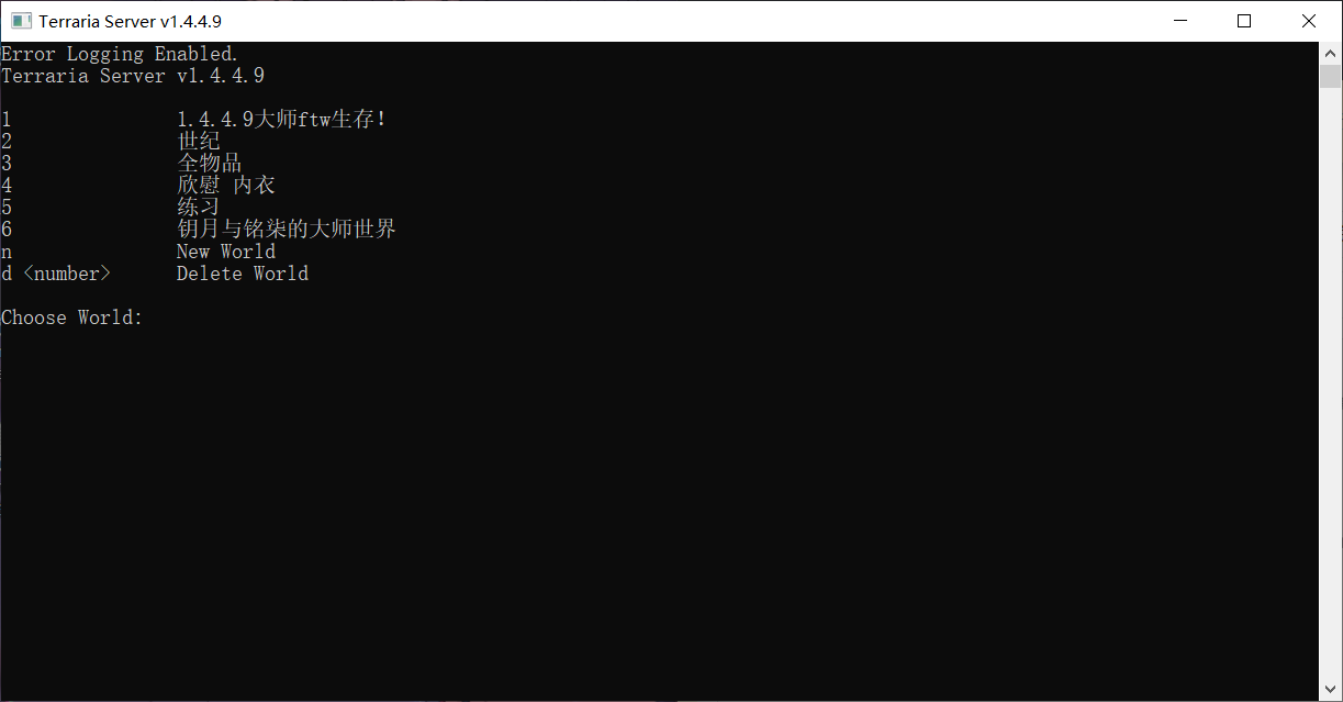 第一步:打开软件,打开后会直接读取你的地图存档并让你选择使用哪个地图开启服务器,(新建地图比较麻烦就不在演示)输入数字后回车表示你选择的地图,输入n后回车表示新建一个新的地图,输入d 数字后回车表示 删除你选择的地图。