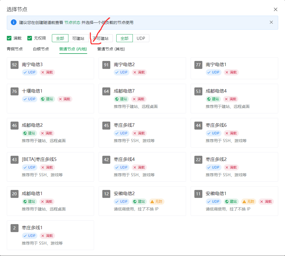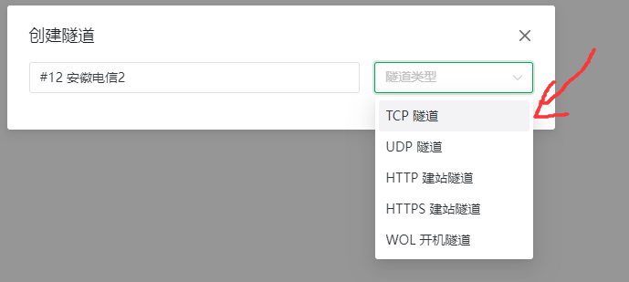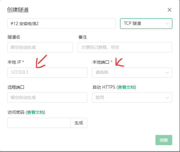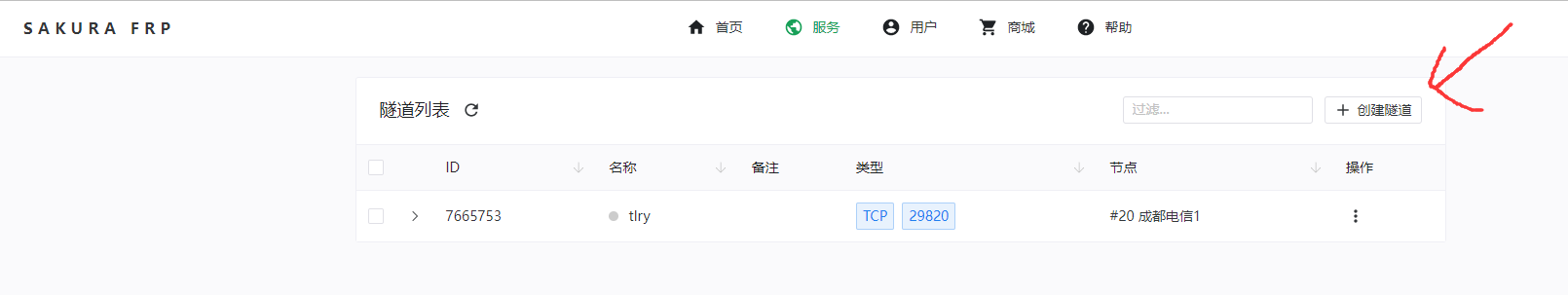 第六步:进入隧道列表后创建隧道,选择普通站点内地,找到一个站点选择隧道类型为tcp隧道,本地IP为主机的IP(获得主机IP地址的方法见第二部分最后局域网联机那里),本地端口号选择7777,之后点创建即可。