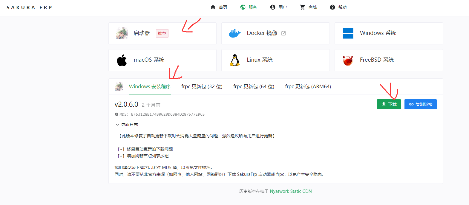 第七步:主页正上方中服务中找到软件下载,进入后选择启动器,win安装程序,点击下载后下载软件下载后进行安装即可。