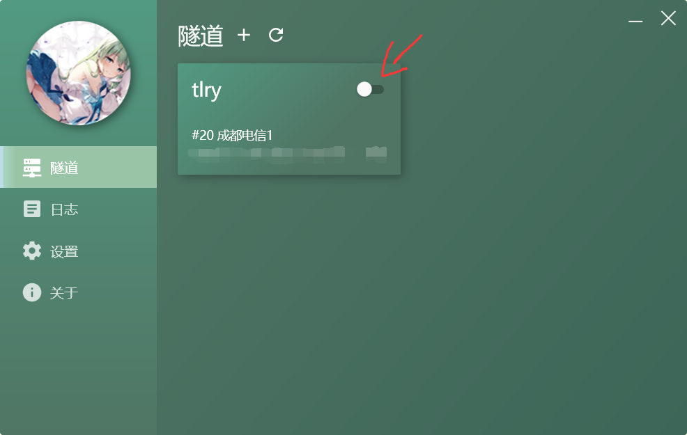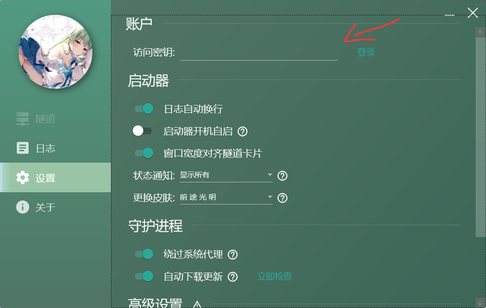第八步:打开安装好的软件会显示需要访问密钥,访问密钥在网站主页的用户的用户信息中,点击‘点击显示’按ctrl+c复制显示出来的密钥回到软件粘贴后登录,登录完成后自动跳转到隧道并显示你之前在网页创建好的隧道,点击该隧道右上角的页面启动即可完成内网映射。