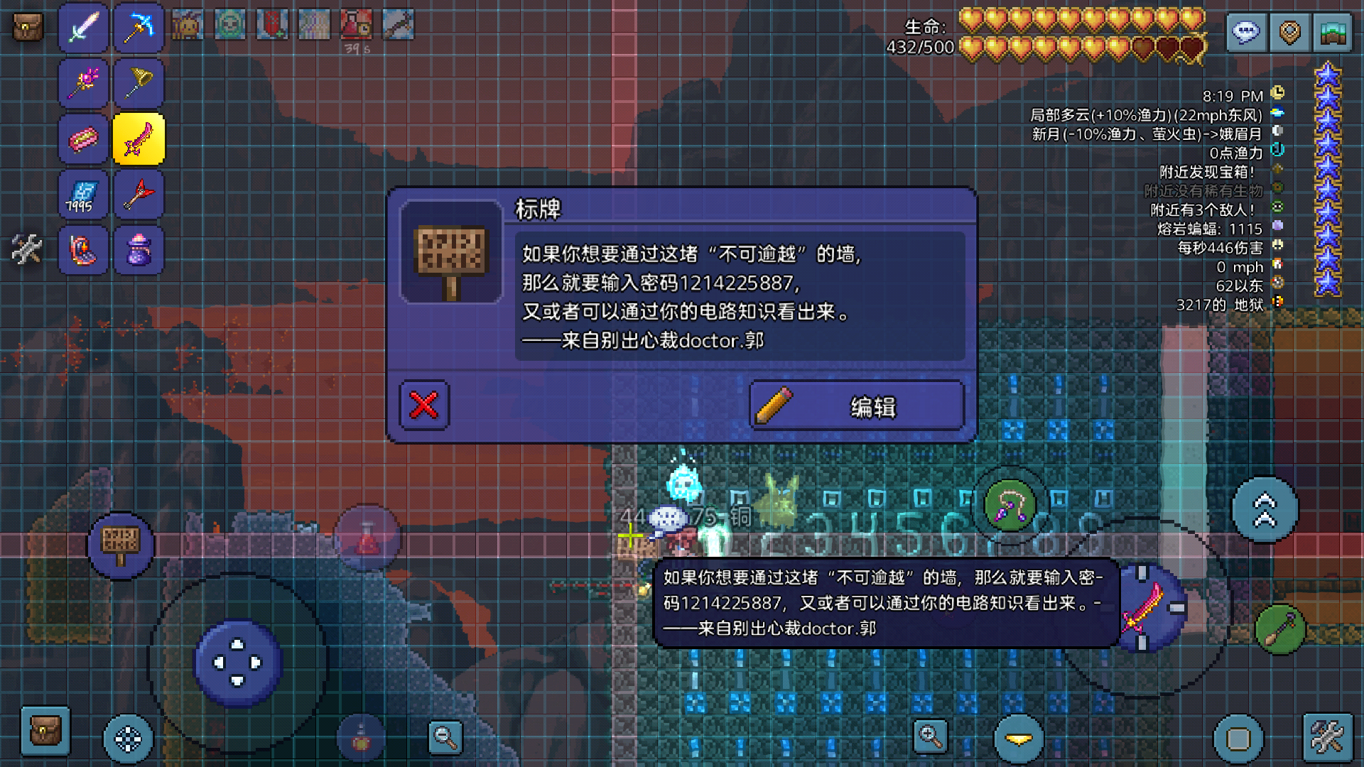 这是一个十位数密码门,可由地狱魔法海螺直接传送到门口。(你要问为什么建在这里?就是没想好,找到一个地方是一个地方。)输入正确密码后,可开门接受惊喜。并且我以后会在里面加点奖品。(特殊小礼物,太贵重的送不起)