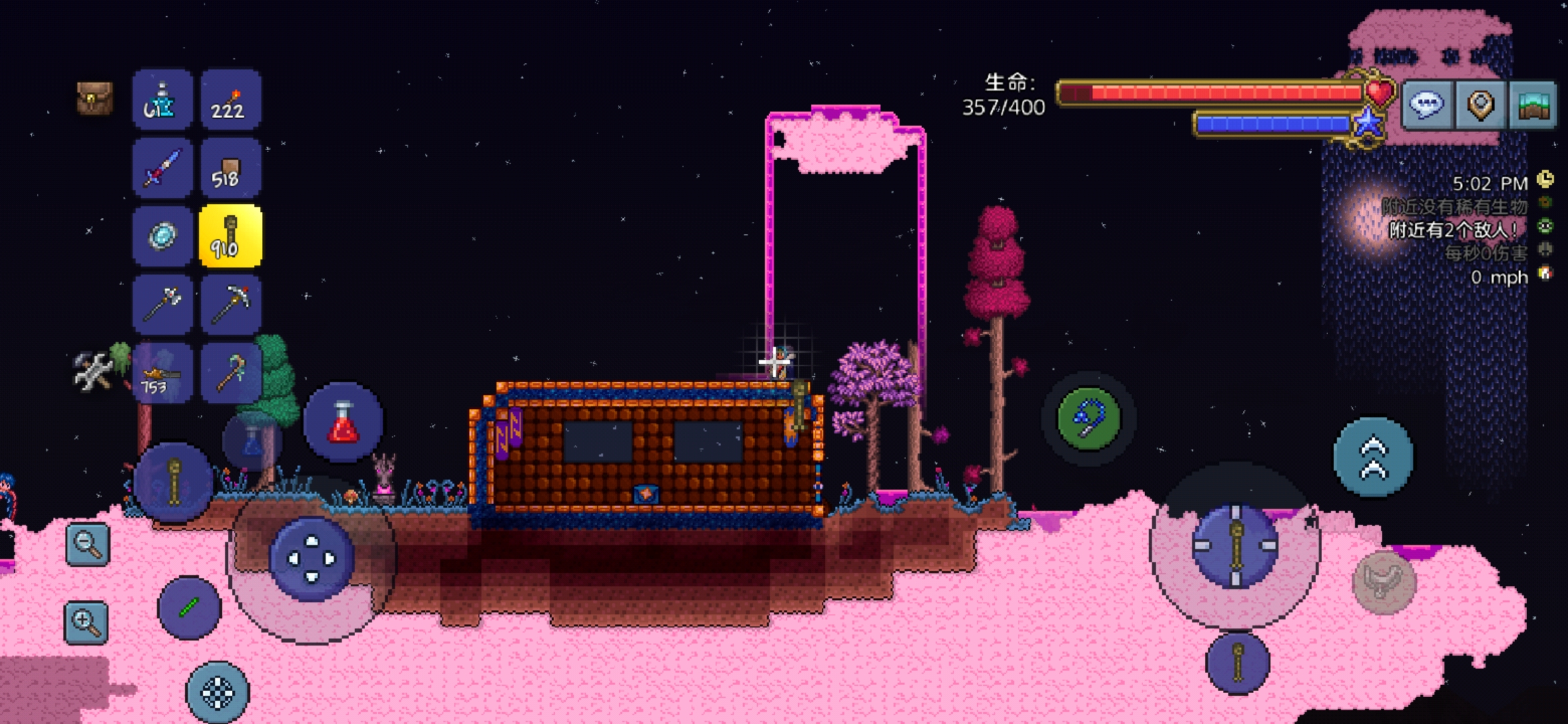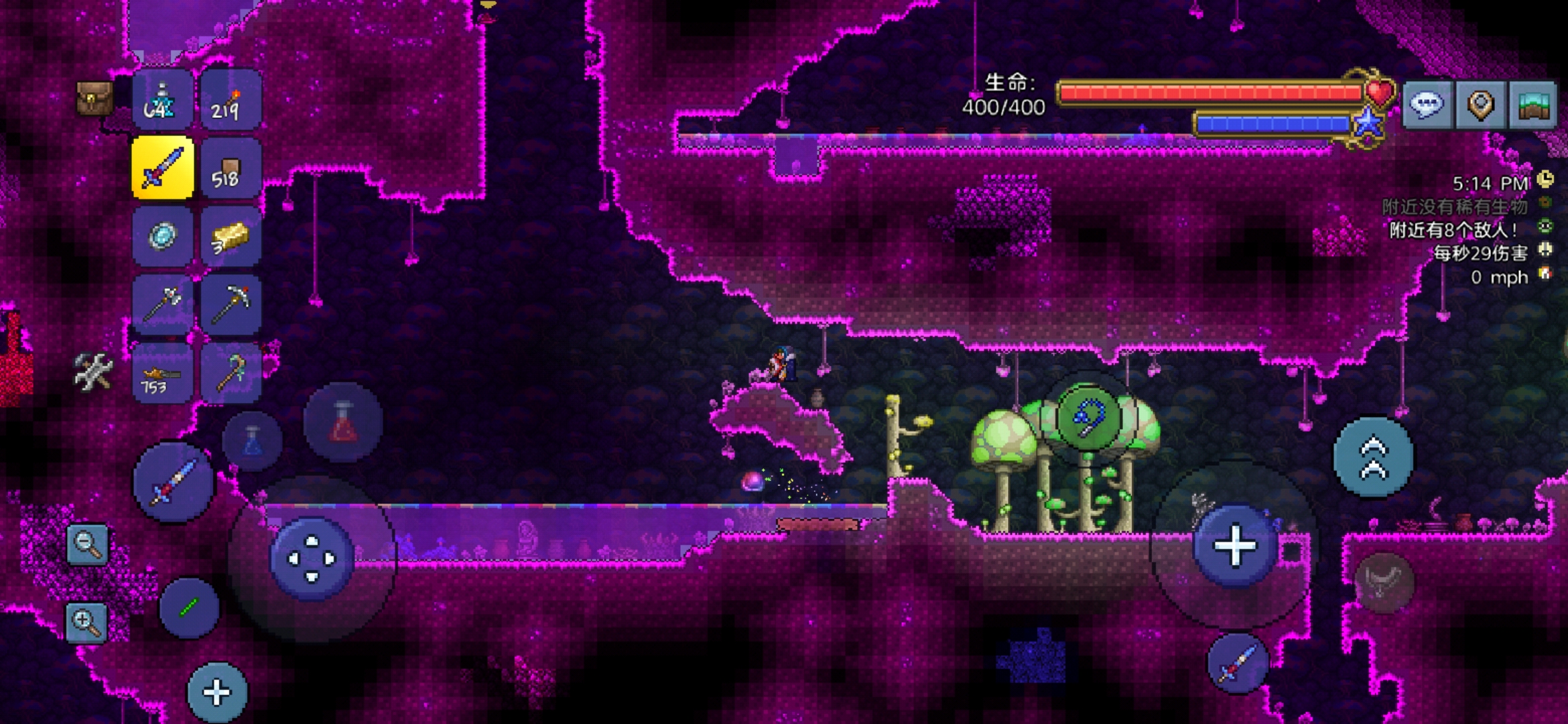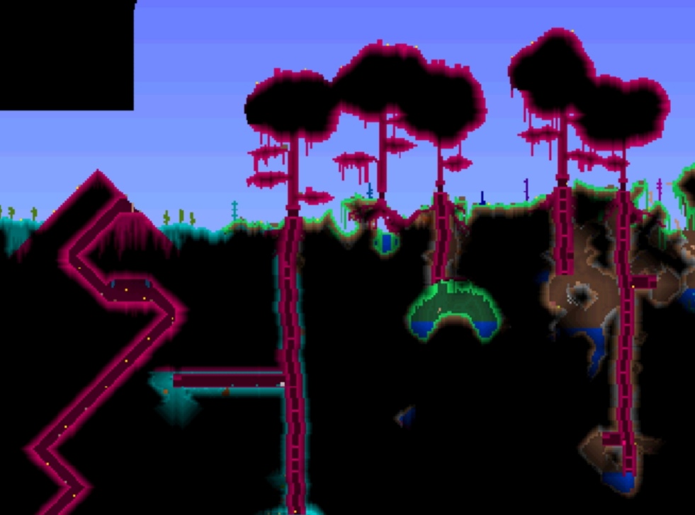 当我们还没有完全适应周围独特有趣的景象时,一片高大的粉红色生命树林出现在了我们眼前。茂密的粉红色树冠使得下方形成了大片的树荫,必然是个乘凉的好地方。生命树的根系下有丰富的物资,其中中间那棵居然还连通了一个附魔剑冢。不过话说回来,这里的生物也都非常有活力,尤其是侏儒,他们比兔子还敏捷的多,但也比兔子危险的多。派对女孩兴奋地提议要在这里建树屋,我觉得是个不错的主意。