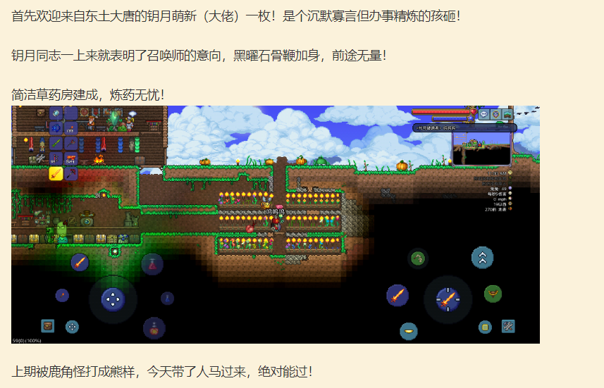1.4.3多人大师召唤师毕业历时46小时,这次我相比第一次隔了好久在此之前也单人通关了好几次地图存档不小心删除了QAQ,这次是多人开荒也是我第一次和网友多人开荒,刚开始有点紧张都不敢说话,还被破晓大佬发现了,慢慢接触时间多了也融入进去了,也是我第一次练白光硬生生死了一个下午,最终拿到了泰拉棱镜,同时闲来无事就研究研究时装化身召唤女仆嘿嘿。