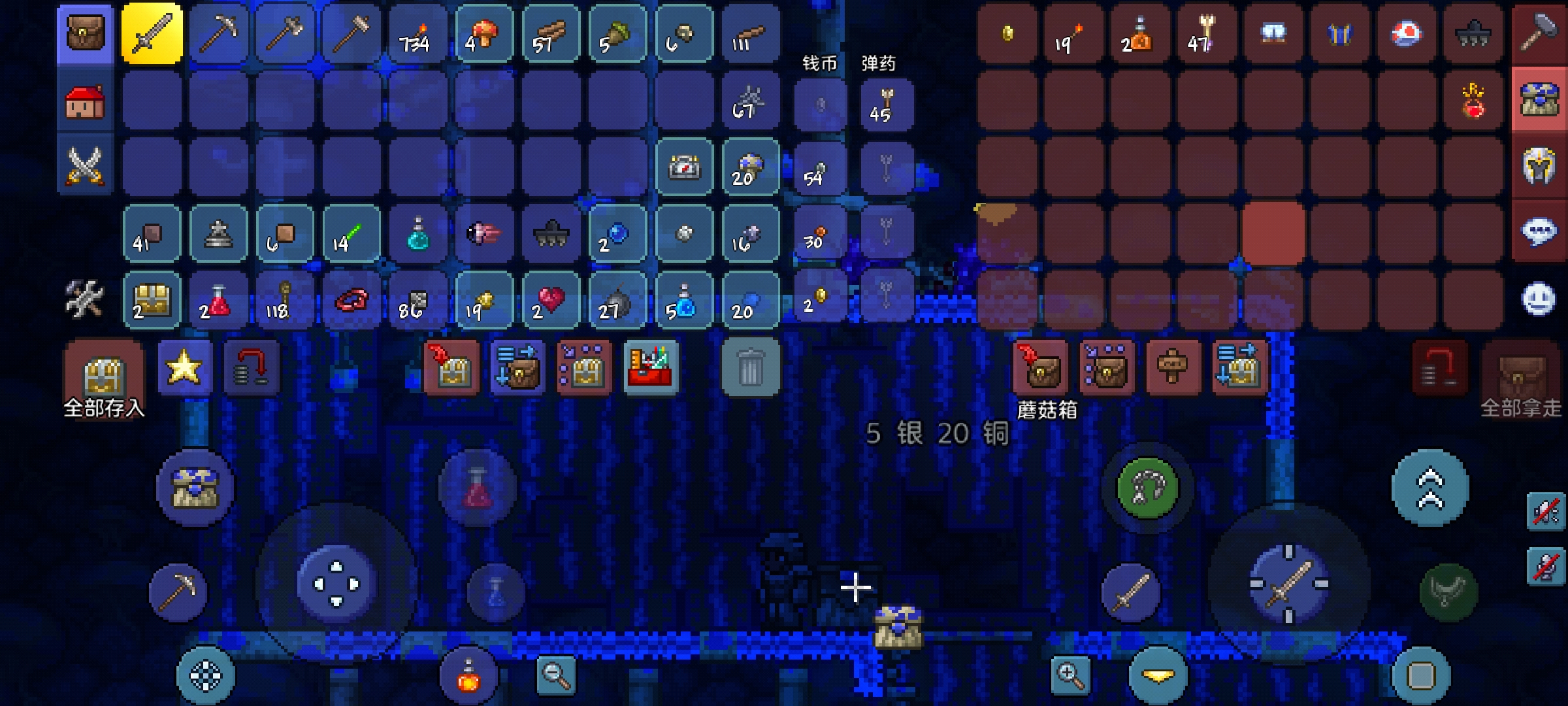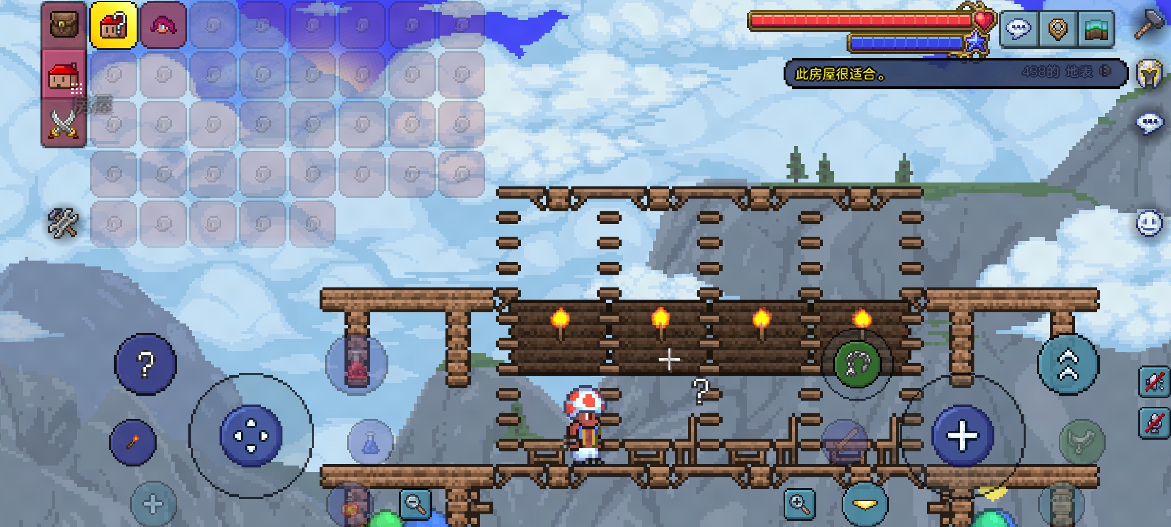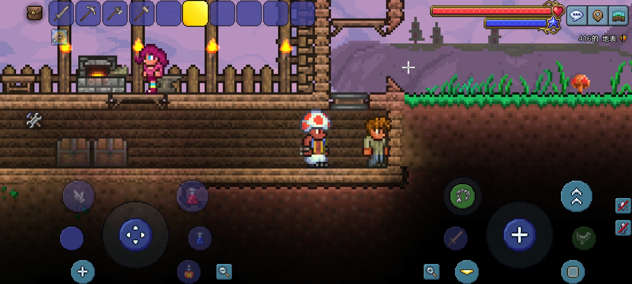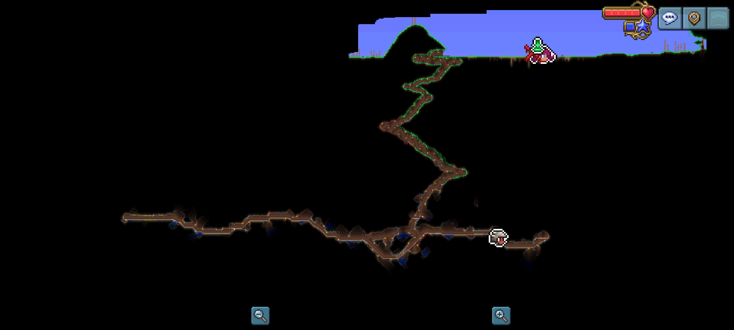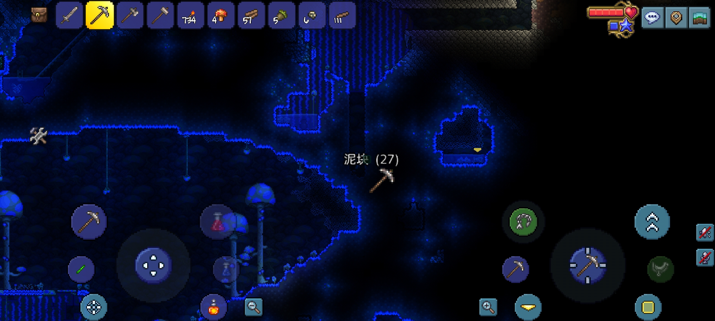 在下挖的途中,我发现了蘑菇小屋还有左上角的一个隐隐约约的生命水晶,等我们探索完蘑菇小屋就去挖那颗生命水晶吧!